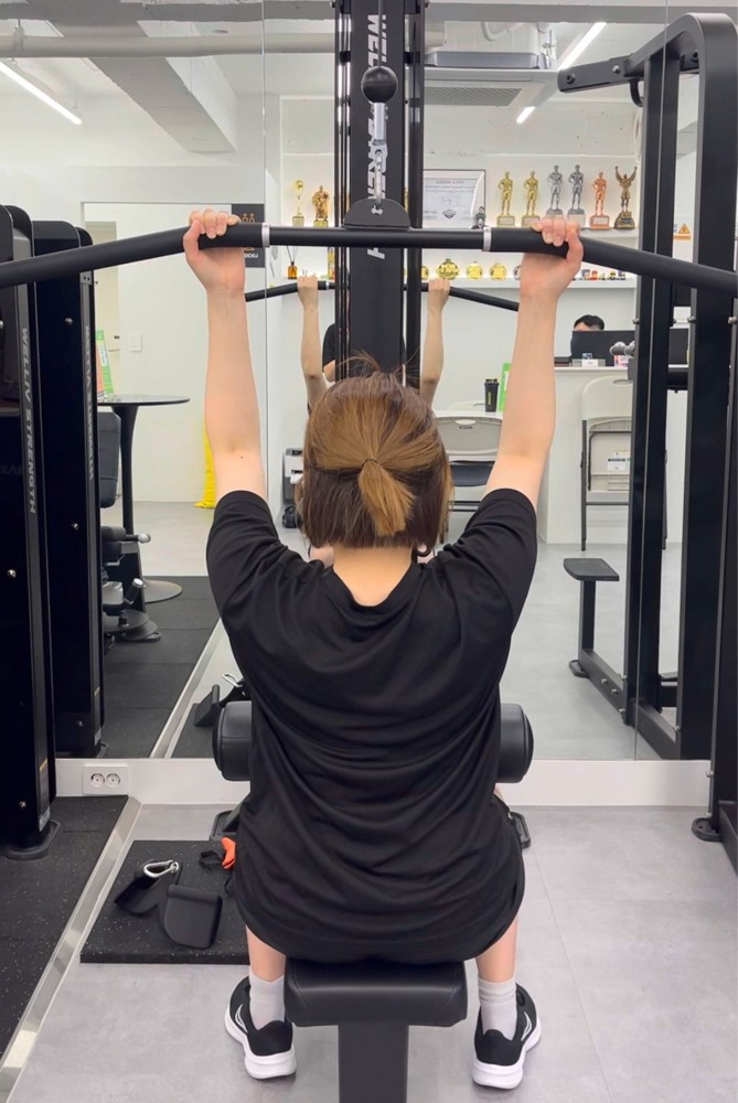 처음에는 라운드숄더가 너무 심해서 동작도 잘 안되었는데 5주가 지나고나니 아직 부족하지만 가슴이 많이 펴졌습니다.