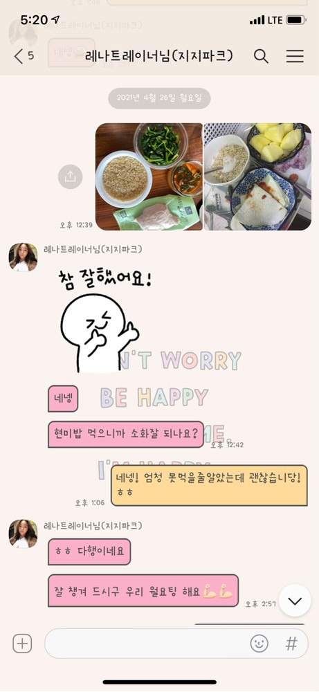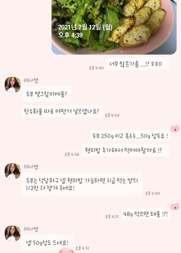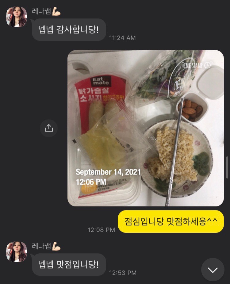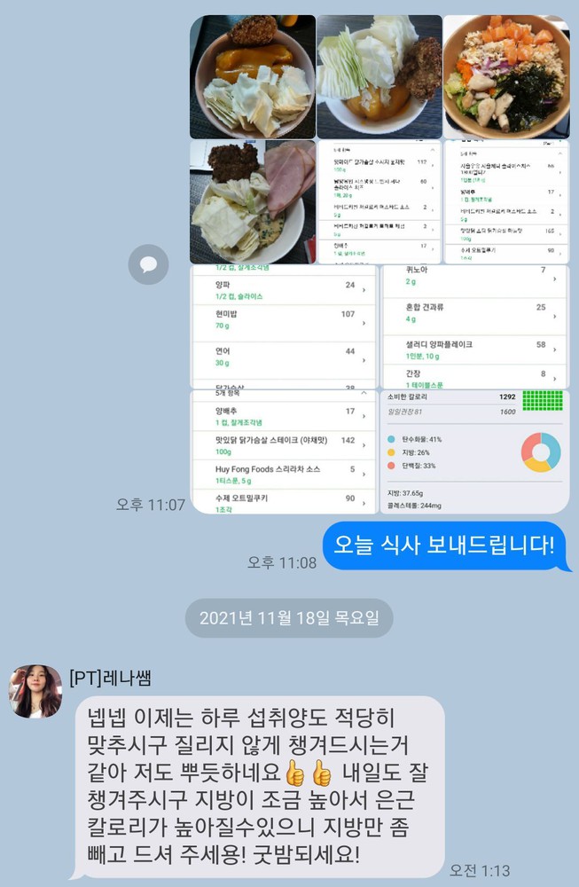 식단도 부족하거나 과한 것들을 바로 피드백해주셔서 이젠 혼자서도 탄단지 비율로 잘 챙겨먹을 수 있게 됐습니다 ! 요즘 무기력했던 저에게 운동하는 것에 대한 재미를 알려주셔서 너무 감사하고, 정말 믿고 따를 수 있는 선생님이라 꼭 추천합니당👍🏻✨✨💛
