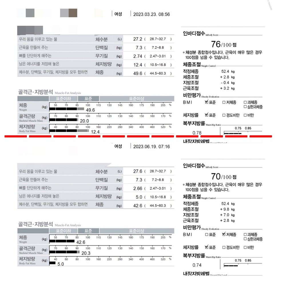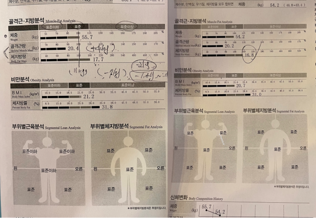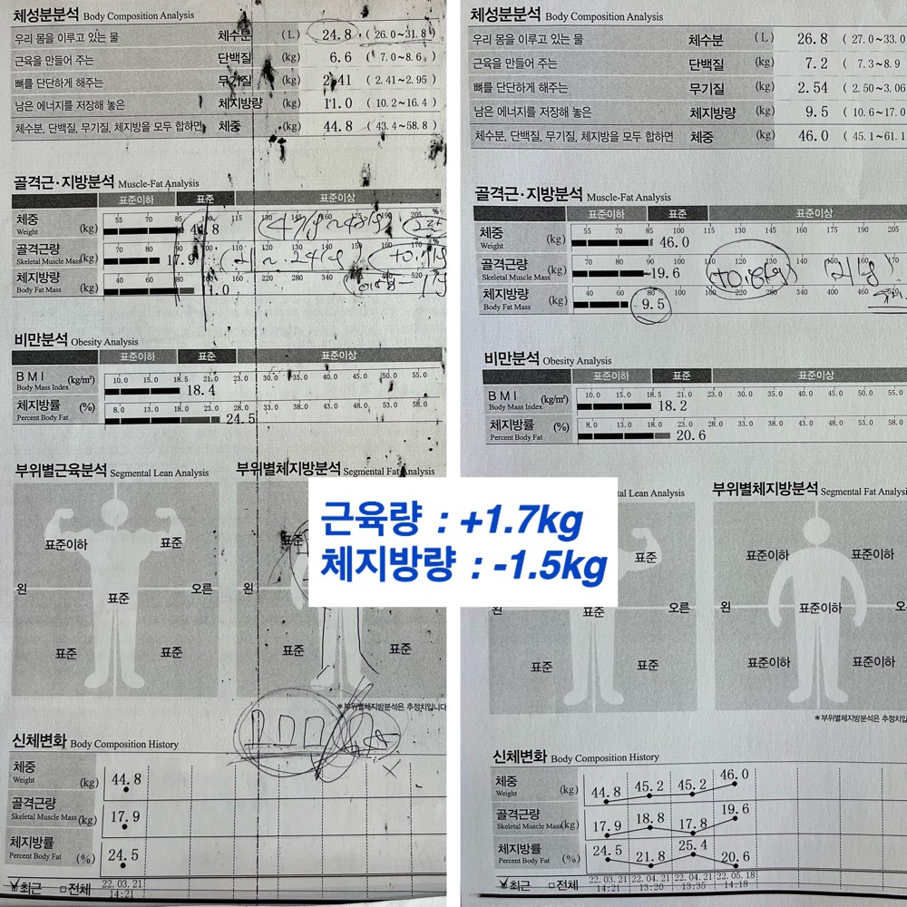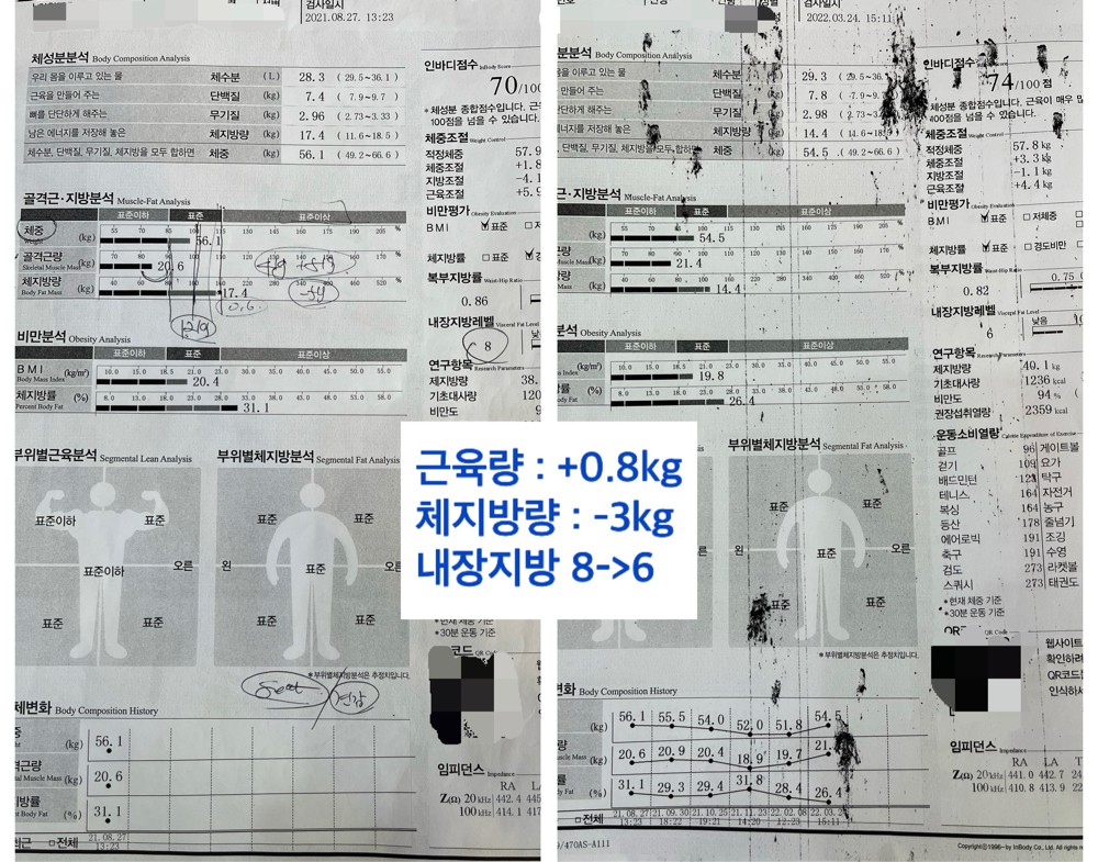 두 달전 운닥 리뷰를 훑어보면서 제 인생 최초 운동의 시작을 함께할 트레이너쌤을 찾아 헤맸는데 이제 제가 그 성공 리뷰를 쓰고 있다니 감회가 새롭습니다.ㅎㅎ 레나쌤은 한마디로 정말 개인 맞춤화 트레이닝의 정석이라고 감히 말씀드리고 싶어요~!결과는 이미지를 보시면 아시겠죠? 레나쌤은 개개인에게 맞춤 운동으로 절대 무리되지 않는 선에서 운동을 꾸준히, 효율적으로 올바르게하는 습관을 길러주십니다. 천성부터 게으르편이라 운동뿐만아니라 식단 잘 지키지 못한 저 같은 유형도 한달안에 변화될 수 있음을 말만이 아니라 직접 보여주셨습니다.ㅎㅎ 사실 선생님이 시키는거 50프로? 이하로 밖에 못따라갔음에도 불구하고 이미지와 같은 긍정적인 결과로 이어져 저도 신기했습니다ㅎㅎㅎ(특히 짜주신 식단은 못따라갔..) 레나쌤짱