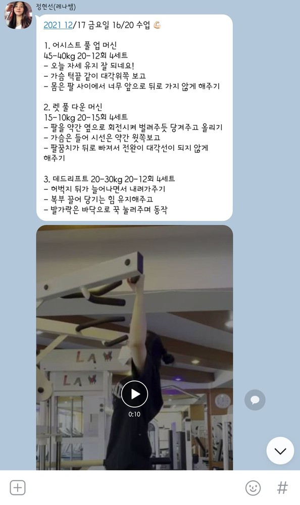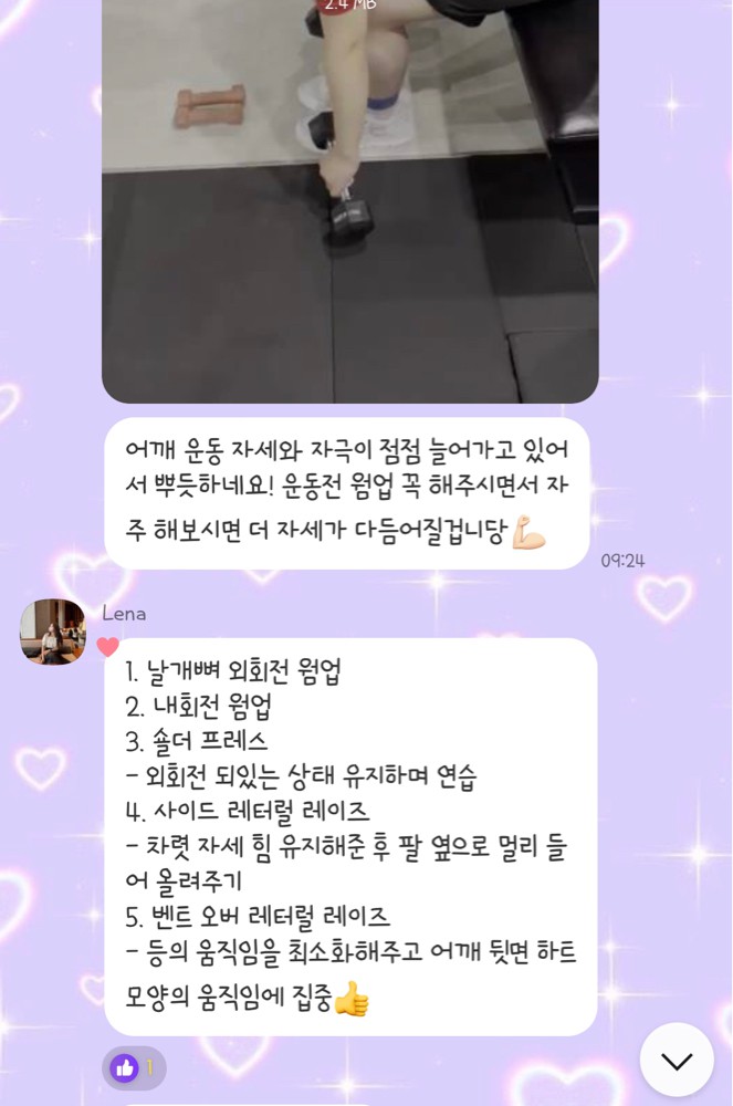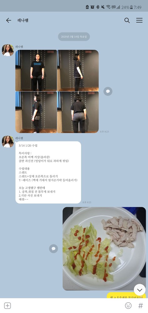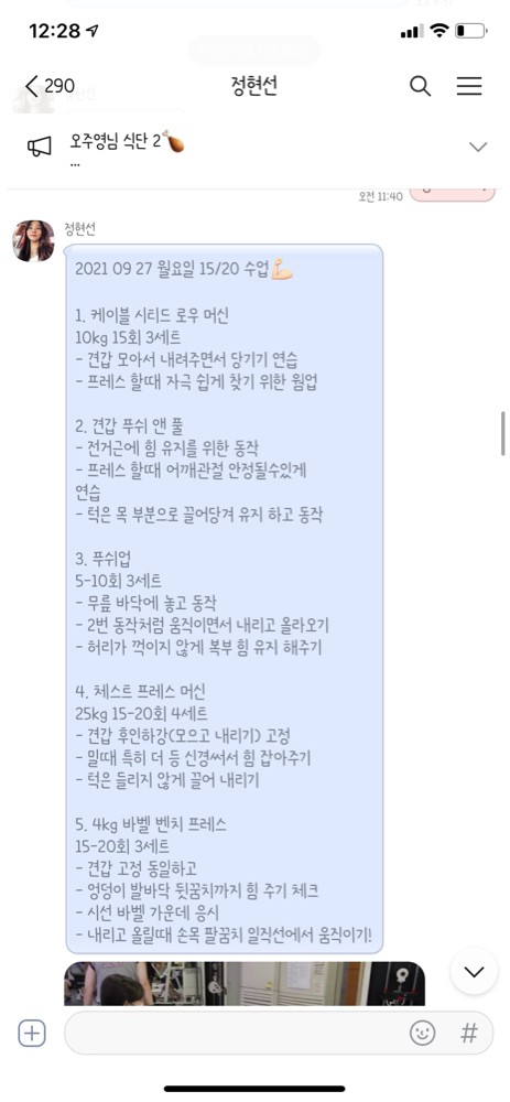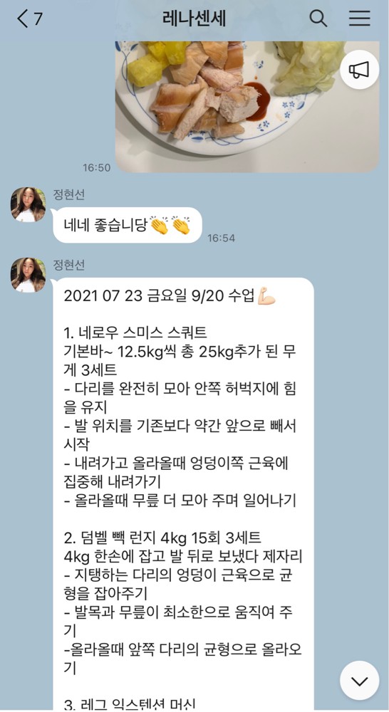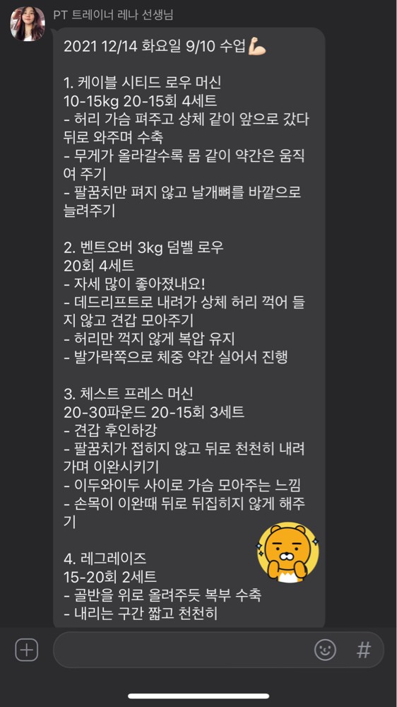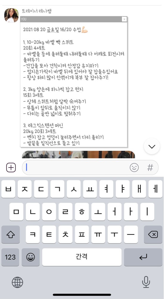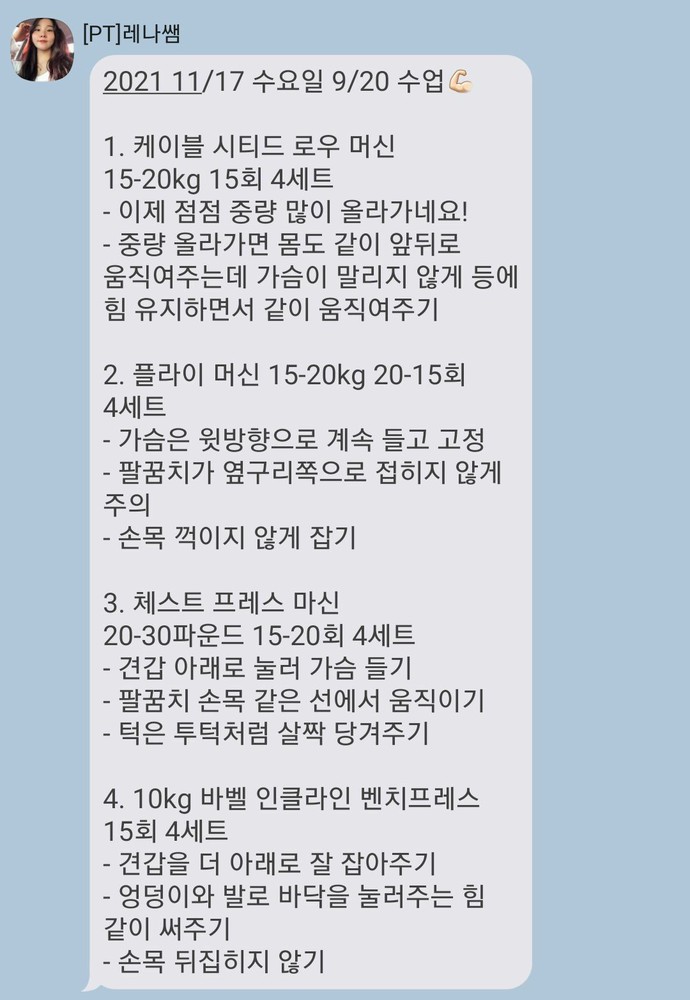 수업 후 자세나 주의사항 등을 카톡으로 남겨주셔서 운동법을 익히는 데에 큰 도움이 돼요🥹