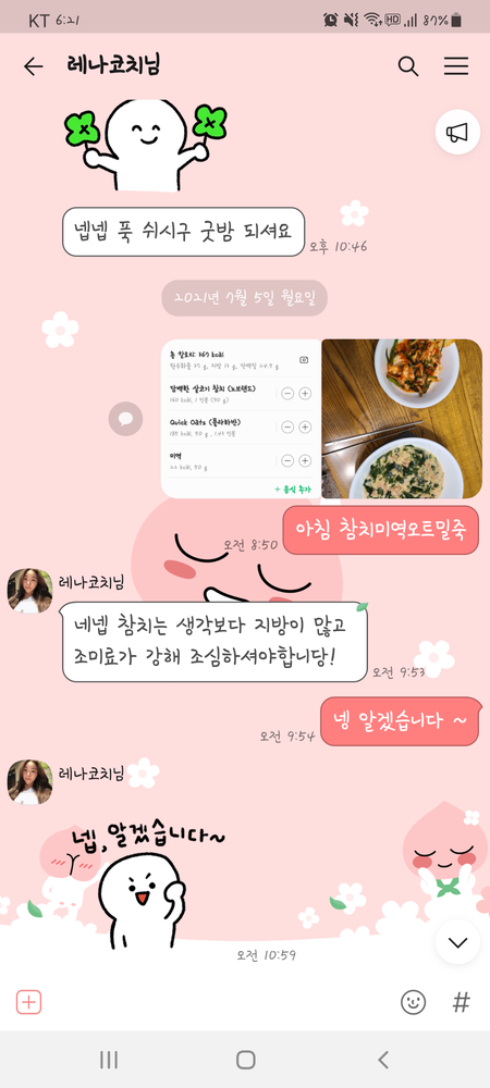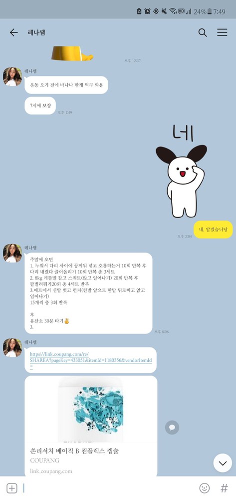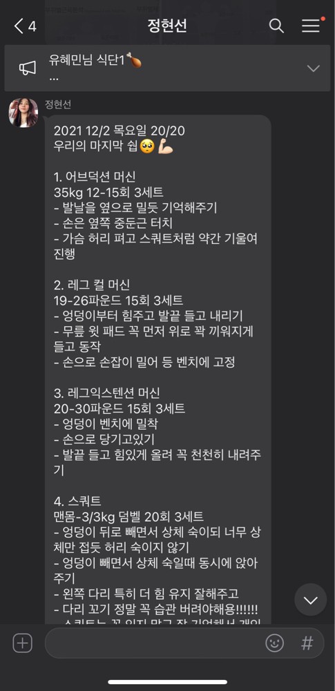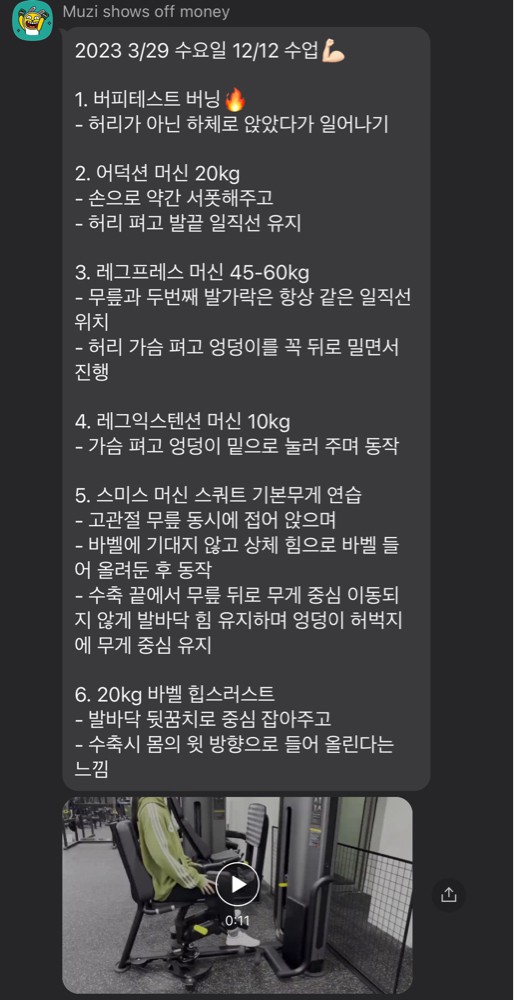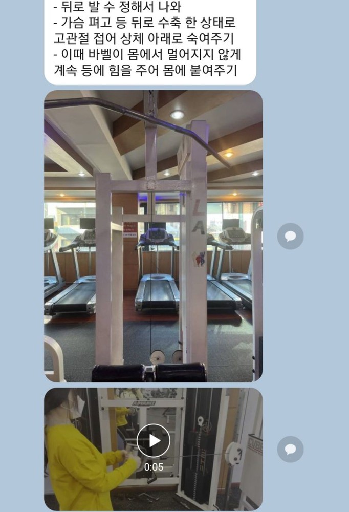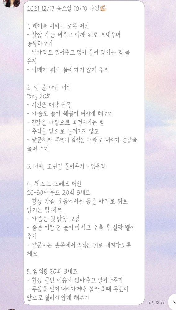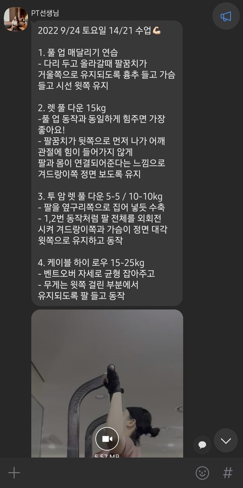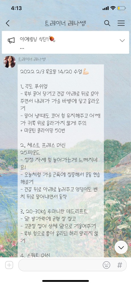 수업 후 자세나 주의사항 등을 카톡으로 남겨주셔서 운동법을 익히는 데에 큰 도움이 돼요🥹