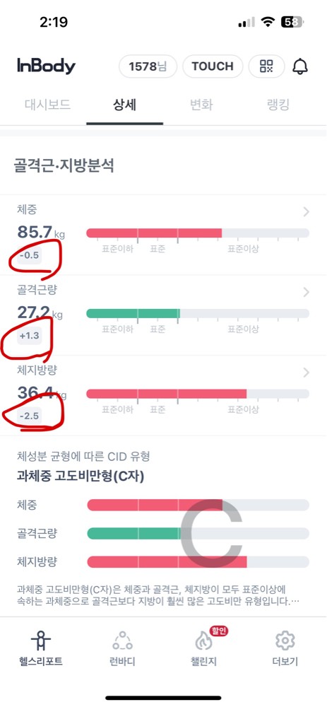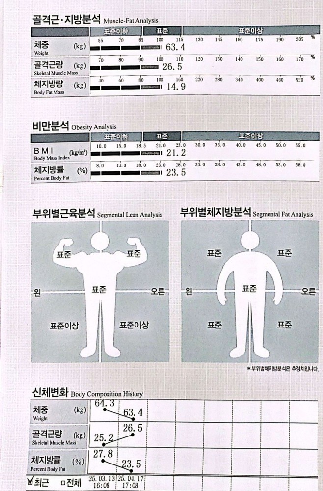 한 달 반 동안 15회차를 진행했는데, 그 짧은 시간 동안 골격근량이 2kg 가까이 늘고 체지방률이 꾸준히 감소해서 제 눈바디에 스스로도 놀라고 있어요:) 운동에 대한 부담감이 컸던 저에게 맞춤형 루틴으로 단계별 수업을 구성해주시고, 올바른 자세를 꼼꼼히 잡아주신 덕분에 운동이 점점 즐거워졌습니다! 특히 그날 컨디션에 따라 유연하게 수업을 조절해주시고, 정말 알찬 수업을 해주십니다❤️🔥 늘 긍정적인 에너지로 응원해주셔서 지치지 않고 꾸준히 올 수 있었어요. 단순히 몸의 변화뿐 아니라, 운동을 대하는 마음까지 달라졌다는 게 가장 큰 변화입니다. 이렇게 좋은 피티쌤을 만난 건 제게 정말 큰 행운이에요🍀🙌앞으로 남은 15회도 너무 기대되고, 처음 운동을 시작하시는 분들께 정말로 꼭 추천드리고 싶은 곳이에요!💖