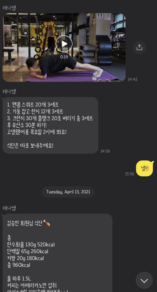 혼자 운동할 수 있게 영상도 촬영해주셔서 개인운동도 수월하게 진행할 수 있었고 항상 힘내라고 해주셔서 힘내서 더 열심히 할 수 있었던 것 같습니다 ㅎㅎ 꾸준히 같이가고싶은 레나쌤이에용 추천합니당👍