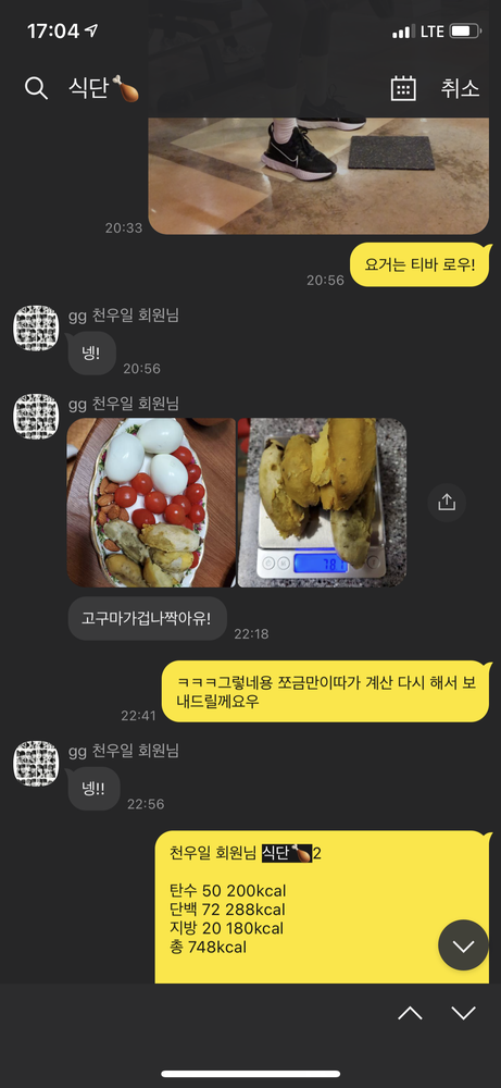 운동하는 모습을 영상으로 찍어주시고, 카톡으로 그날 운동한 내용과 피드백까지 남겨주셔서 혼자서도 복습이 가능한 점도 큰 장 점인 것 같아요!! 타이트한 식단관리보다는 제 몸에 필요한 영양소를 설정해주시고 그에 맞는 음식까지 추천해주셔서 건강한 식 습관까지 챙겨갈 수 있습니다,, 덕분에 운동이 너무 즐거워졌어요 !!!