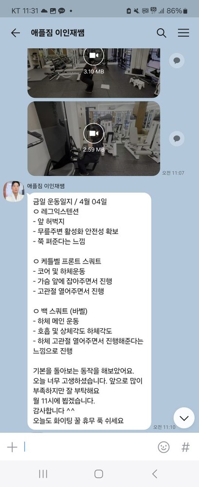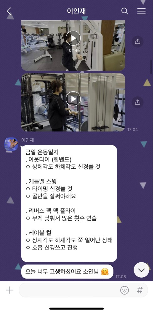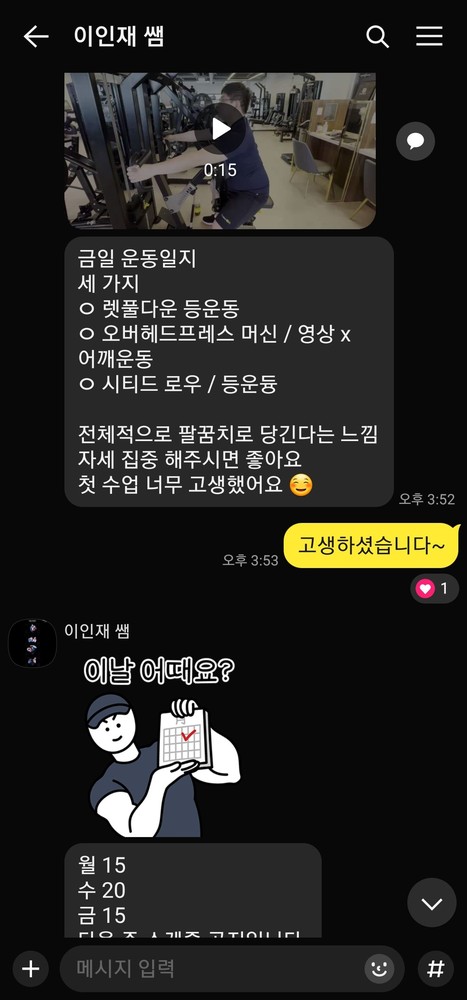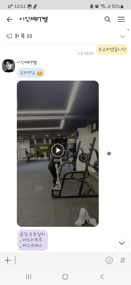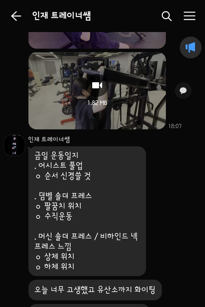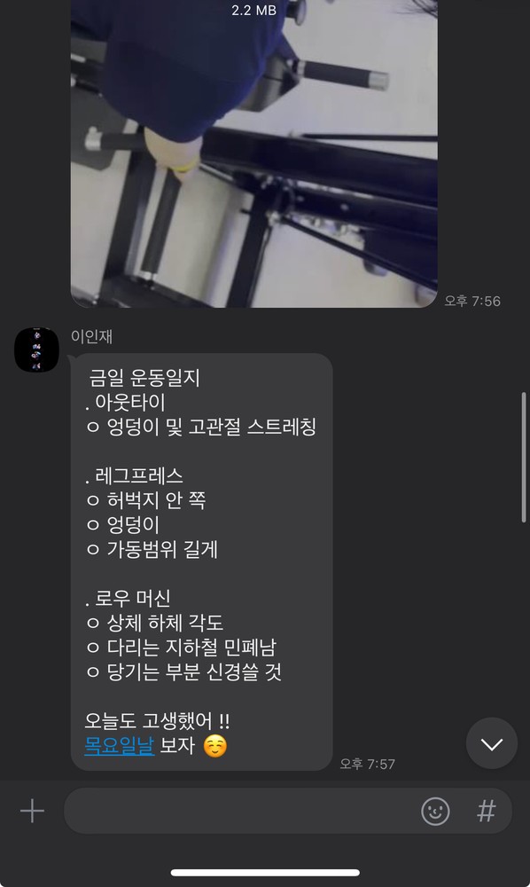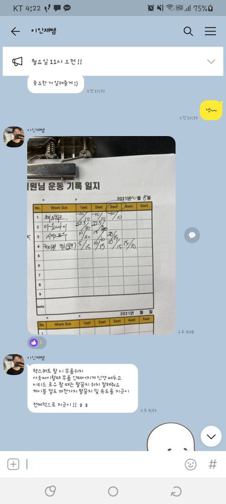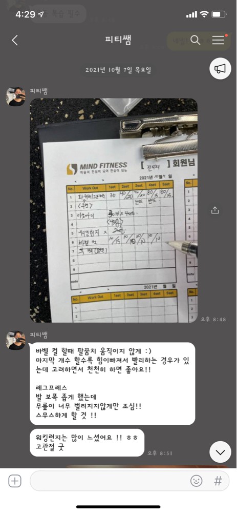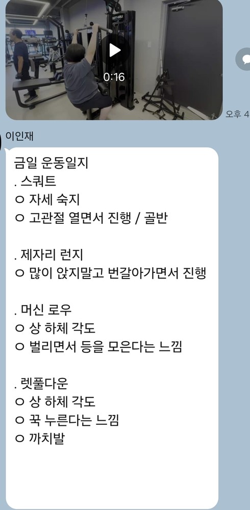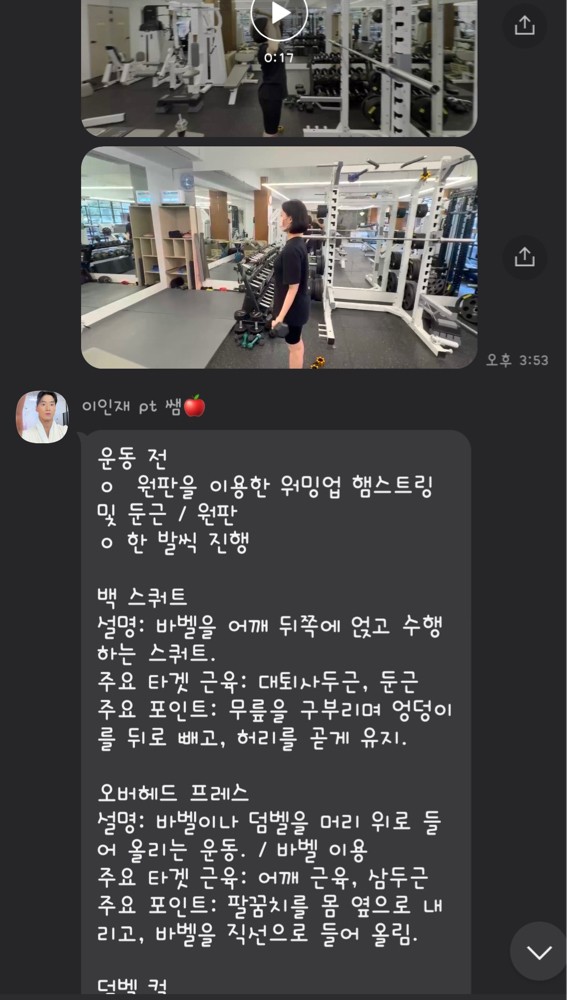 또 제가 운동하는 모습을 영상으로 찍어 주시고 그 날 운동 한 기구의 무게, 횟수를 기록해주셔서 다음날 혼자 헬스장에 와서도 허우적(?) 거리지 않고 스스로 배웠던 운동을 복습할 수 있었습니다.