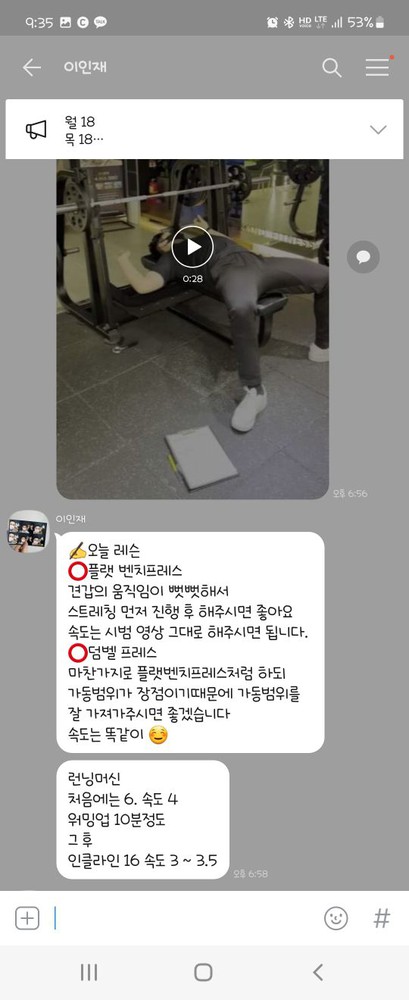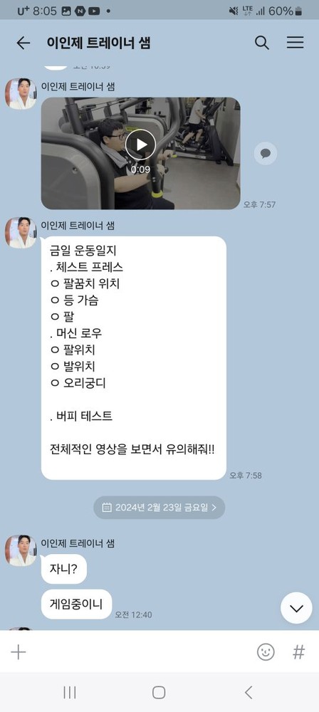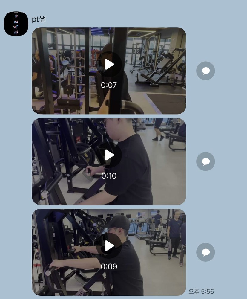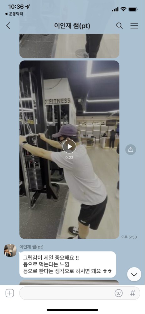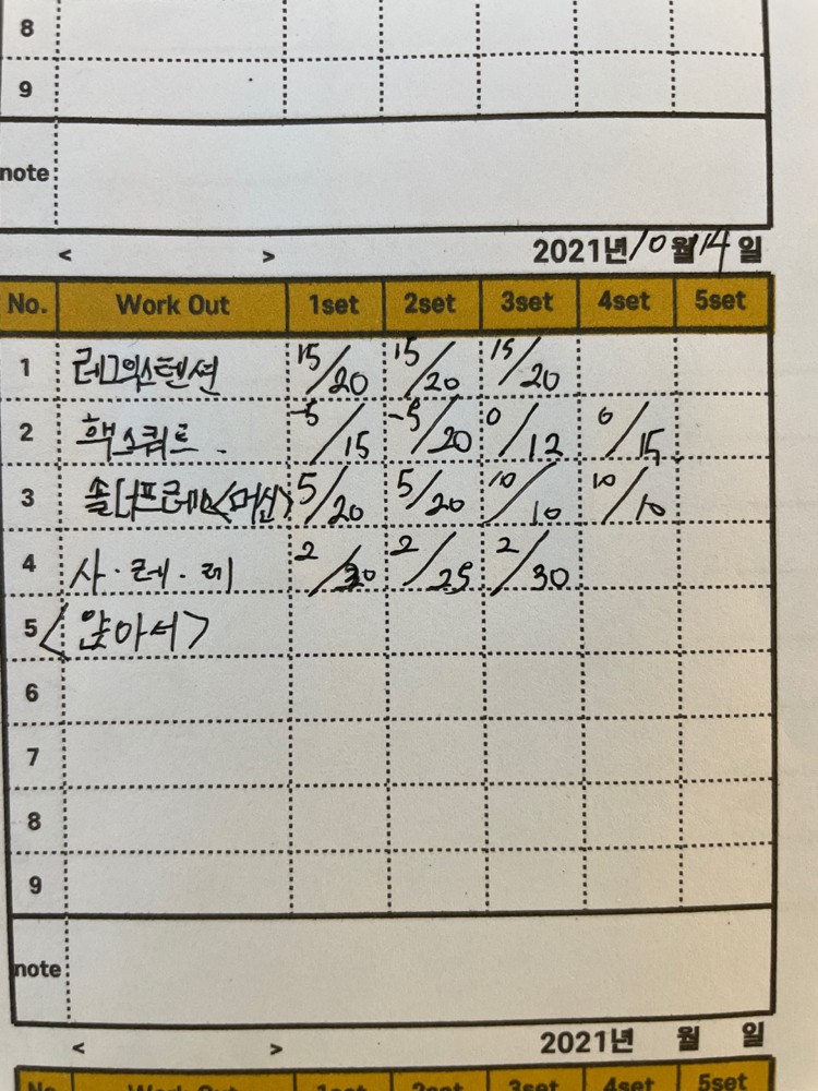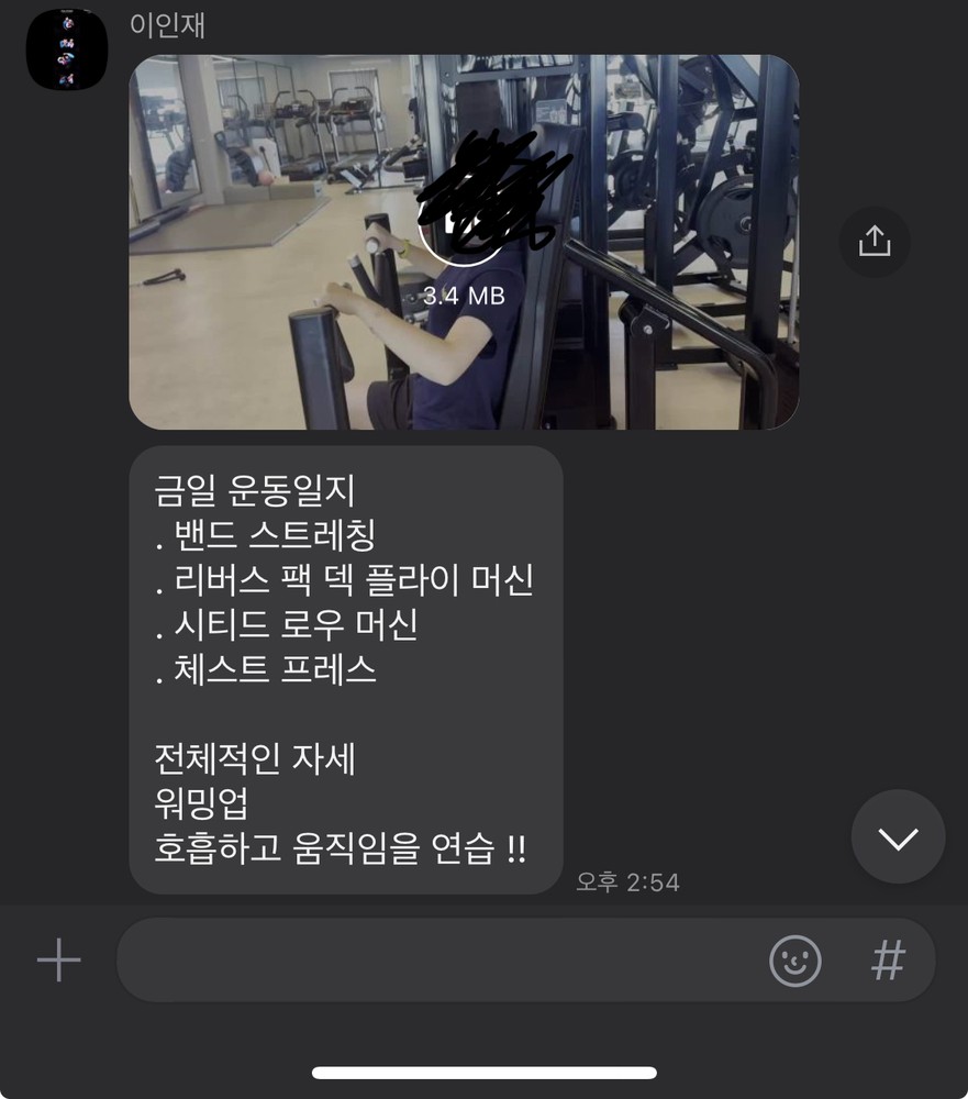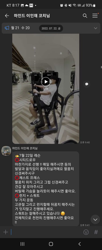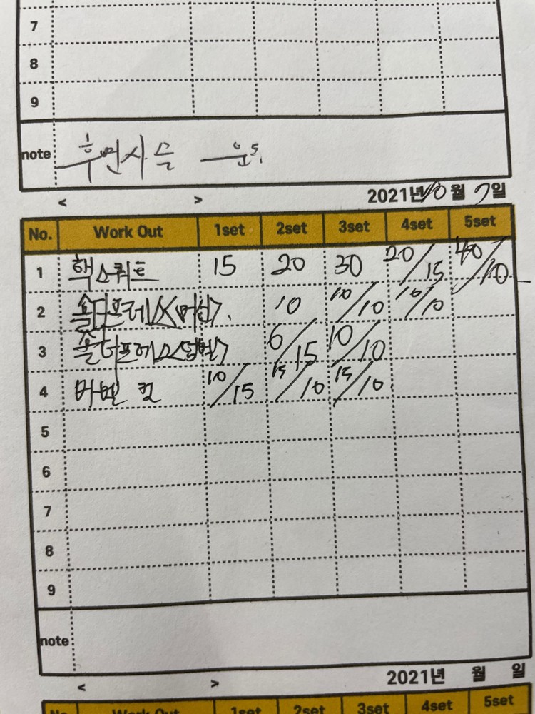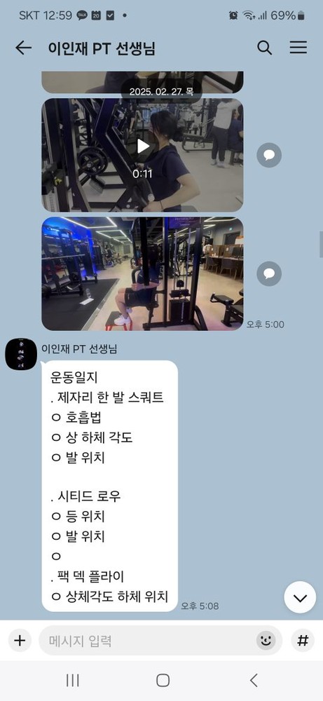 또 제가 운동하는 모습을 영상으로 찍어 주시고 그 날 운동 한 기구의 무게, 횟수를 기록해주셔서 다음날 혼자 헬스장에 와서도 허우적(?) 거리지 않고 스스로 배웠던 운동을 복습할 수 있었습니다.