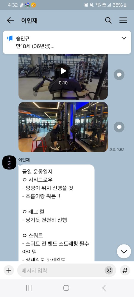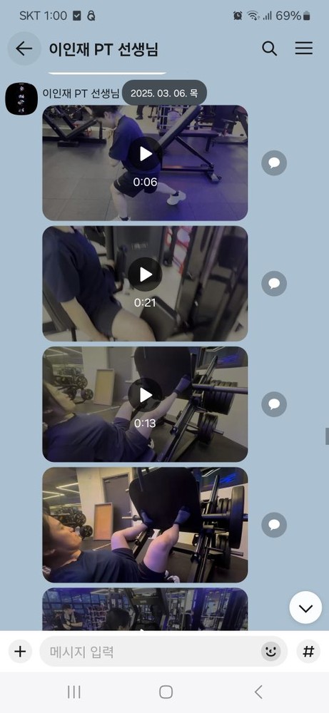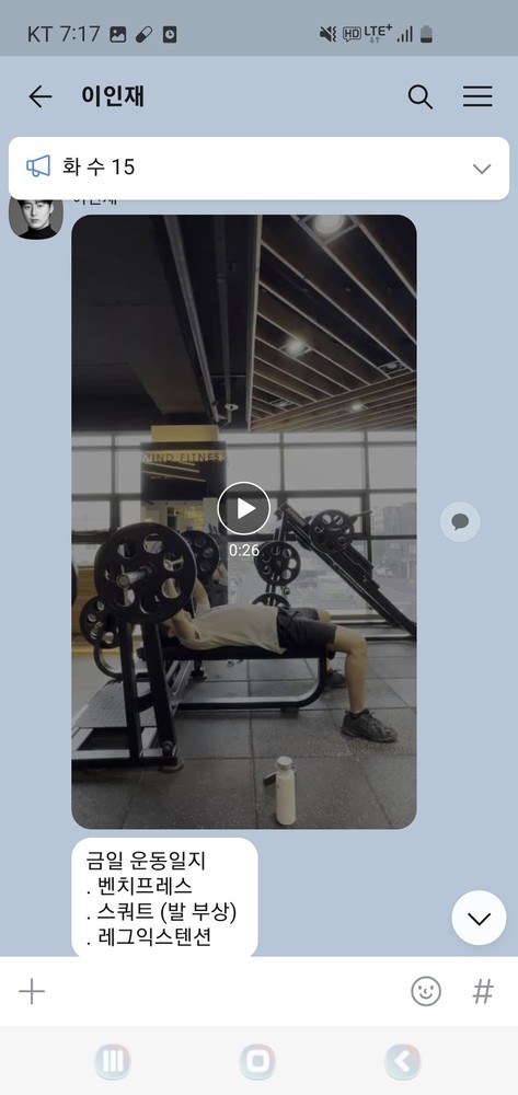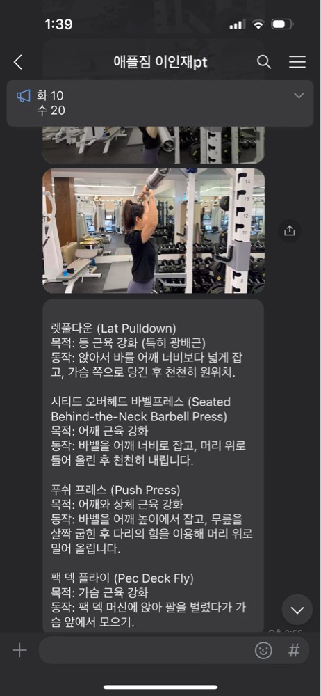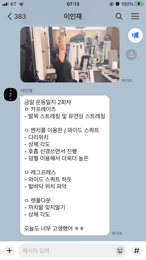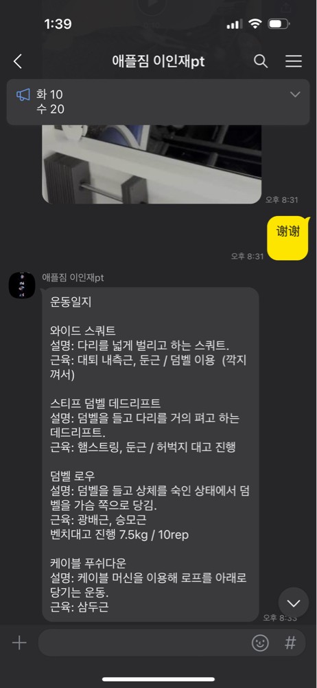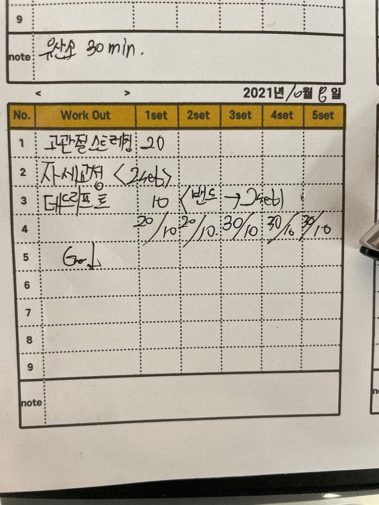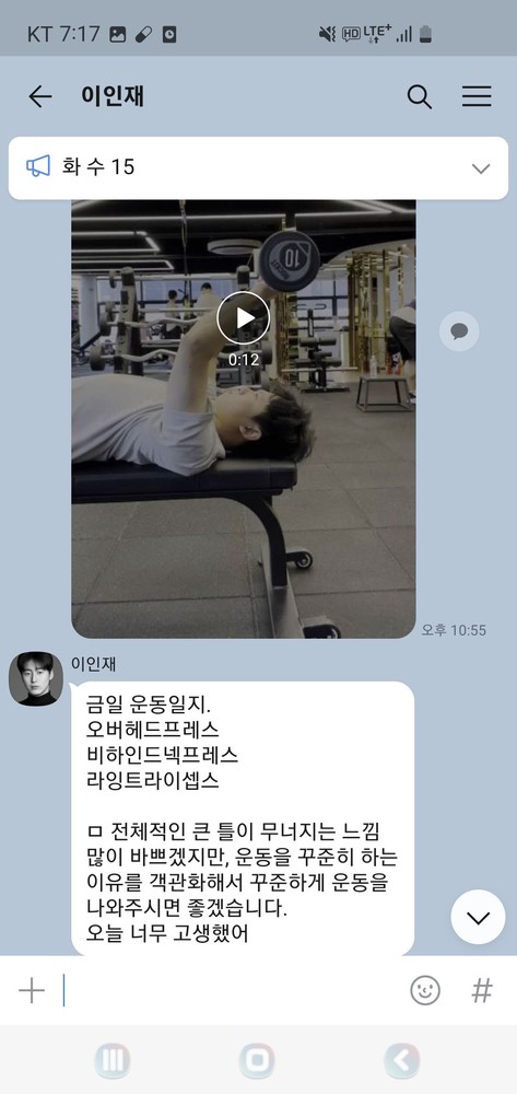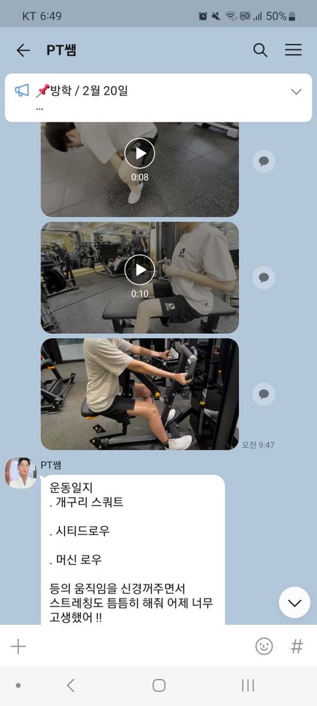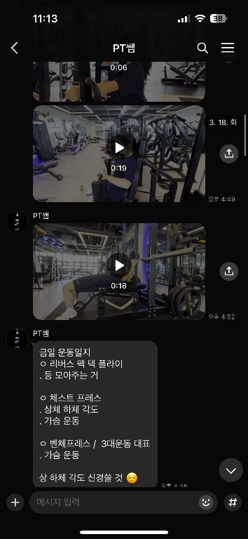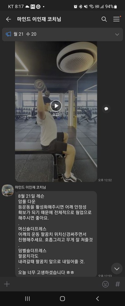 또 제가 운동하는 모습을 영상으로 찍어 주시고 그 날 운동 한 기구의 무게, 횟수를 기록해주셔서 다음날 혼자 헬스장에 와서도 허우적(?) 거리지 않고 스스로 배웠던 운동을 복습할 수 있었습니다.