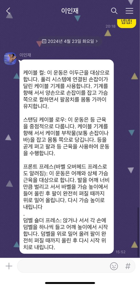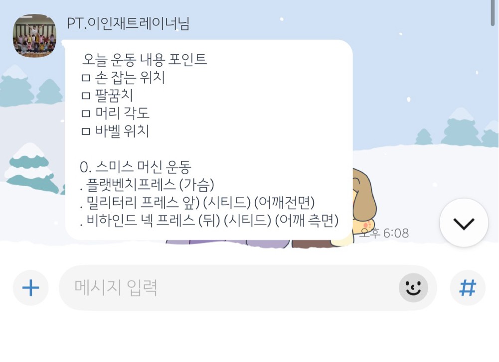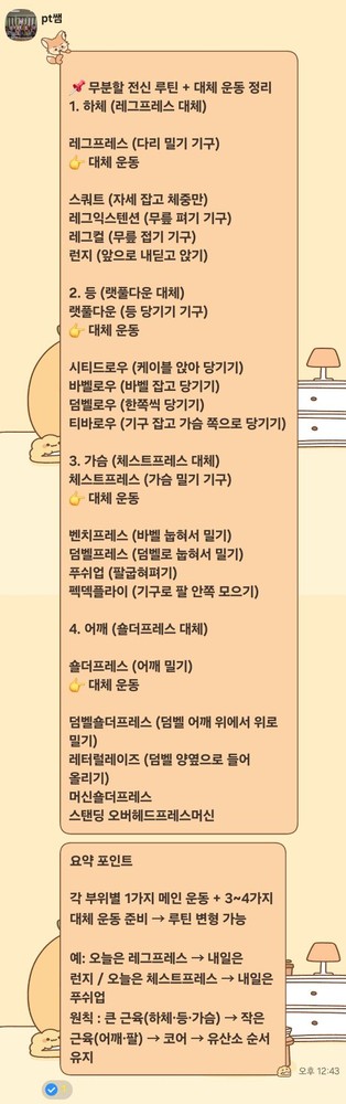운동 좋아하는 만큼 배우는 속도도 정말 빠른 것 같아! 자세 하나하나 신경 쓰면서 운동하는 모습이 보기 좋더라. 보내준 루틴도 잘 따라와줘서 나도 뿌듯해 앞으로도 다치지 않게, 더 재밌게 운동할 수 있게 계속 도와줄게 멸치 탈출가