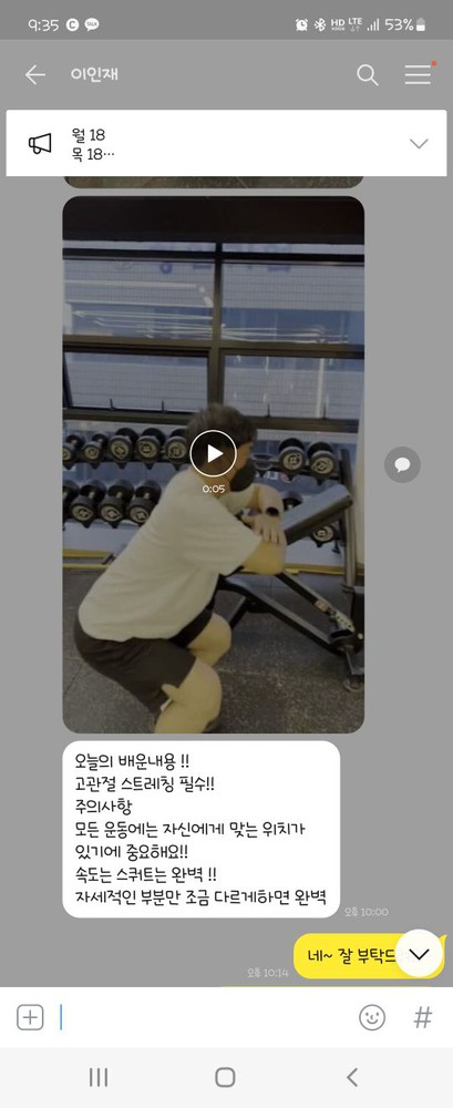 인재 선생님께서는 항상 긍정적인 마인드로 수업에 임하시고 제 컨디션에 알맞게 수업을 진행해주셔서 저 또한 운동이 즐겁고 신나는 일이 될 수 있다는 것을 깨달았습니다.