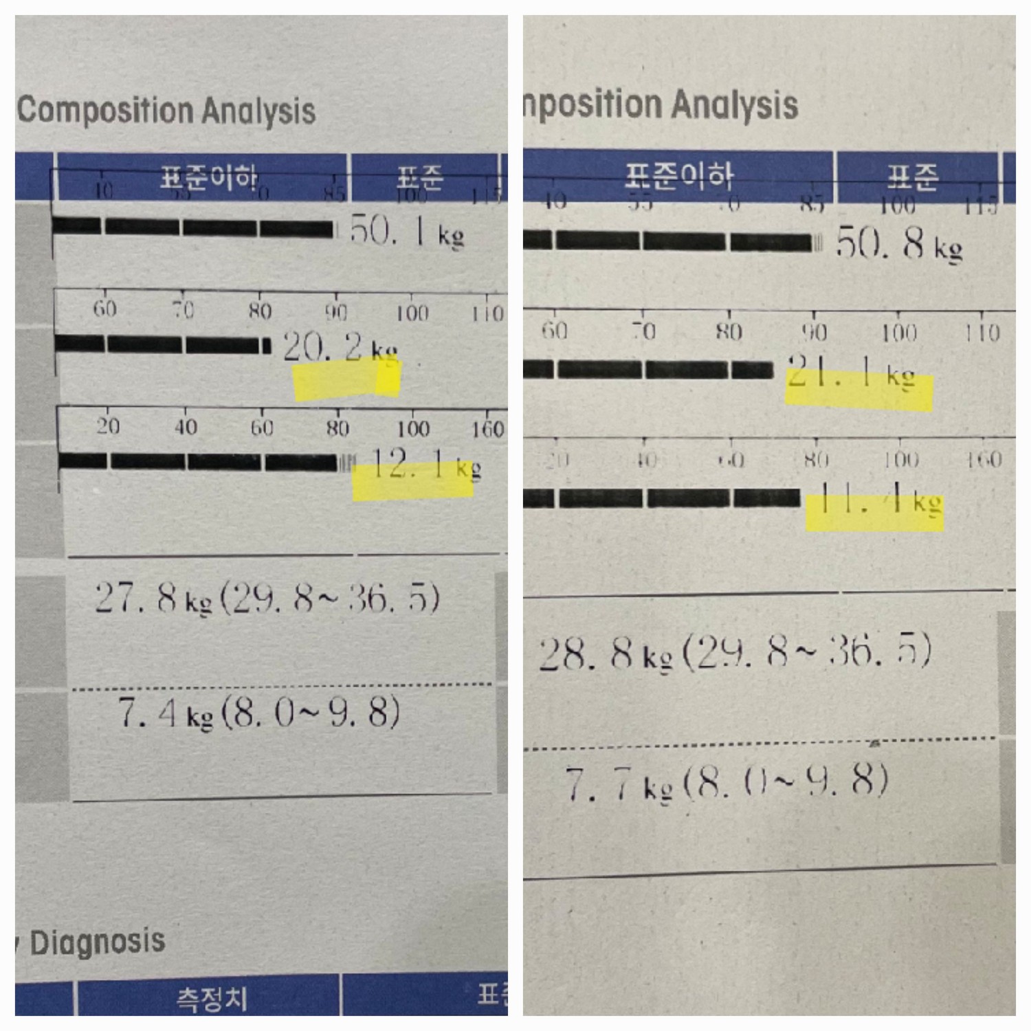 예전에도 헬스를 꾸준히 다녀보려고 한적이 있었는데, 그게 역시 말처럼 쉽지가 않더군요... 아무래도 그때는 동기부여가 좀 부족해서 그랬을수도 있지만 지금은 목표도 생겼고 현재까지 약 3주동안 로라쌤께 운동을 배우면서 헬스의 즐거움에 눈을 제대로 뜬거 같습니다 ㅋㅋㅋㅋ 예전에는 운동할때 1시간이 하루처럼 느껴질정도로 시간이 엄청 느리게 갔었는데, 로라쌤하고 PT할때만큼은 시간이 순식간에 지나간것처럼 느껴질 정도로 엄청 재밌었습니다. 헬스하시면서 "나는 더이상 안될거 같다" 라고 생각하시는분들, 로라쌤이랑 같이 하면 한계가 어디까지인지 감이 안오게 할정도로 엄청 열정적으로 잘 가르쳐주실겁니다. 3주동안 열심히 한 결과 골격근량도 약 2키로 증가 ㅎㅎㅎ 현재까지 받은 수업중에서는 가히 최고라고 해도 아깝지 않습니다