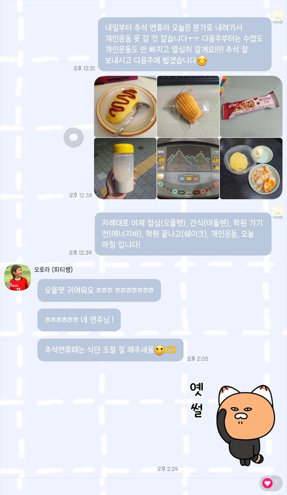 ㅎㅎ 육아와 운동 병행 하느라 힘드셨을텐데도 불구하고 잘 따라와주셔서 감사했습니당 ^^ !! 앞으로는 요요 안오게 꾸준히 운동 해보아요~~~ ღ