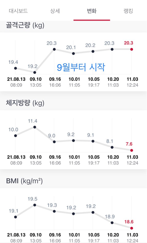 바프 목적으로 운동중이며 강사님 이끌어가는 수업대로 운동하니 보시다시피 근육량은 늘고 체지방은 많이 빠진 상태입니당 😬