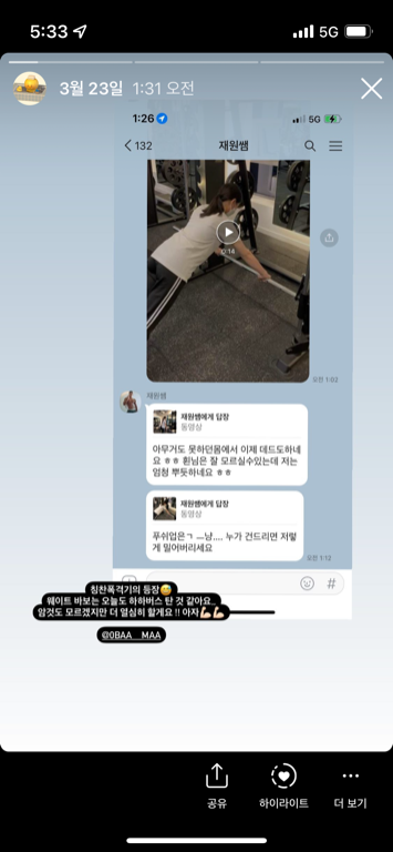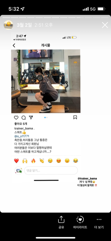 그렇게아픈던무릎도 중량을계속올리는데도 신기하게 안아파요 선생님도 저도 성장하는중입니다.