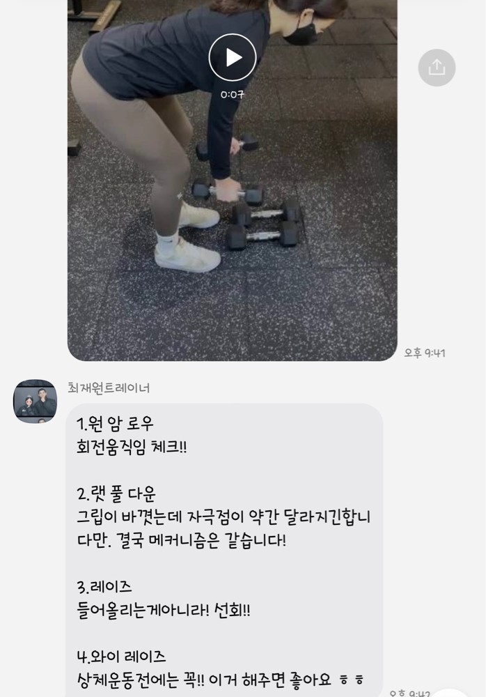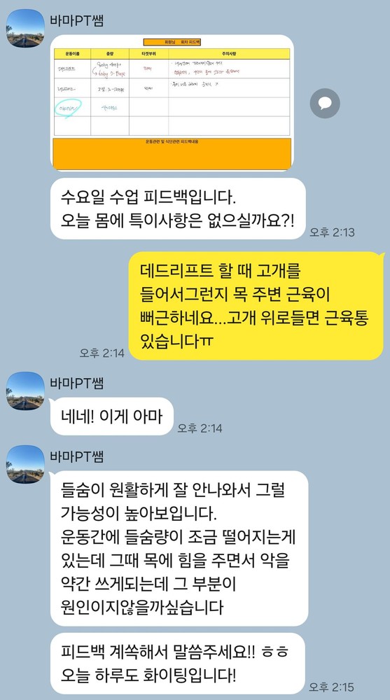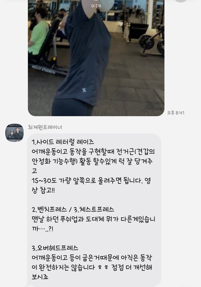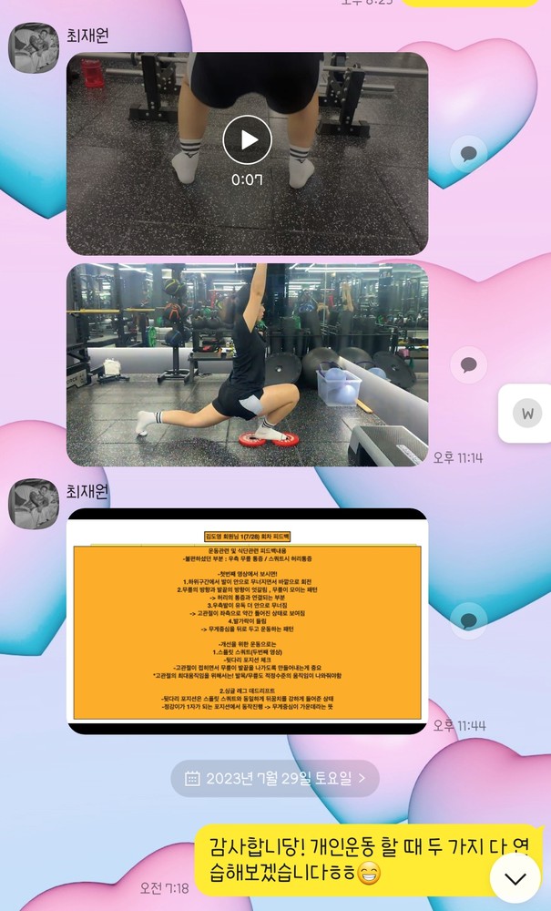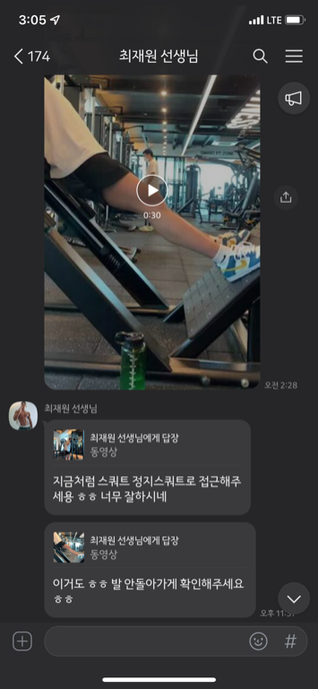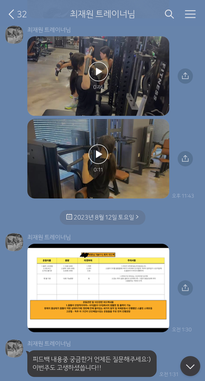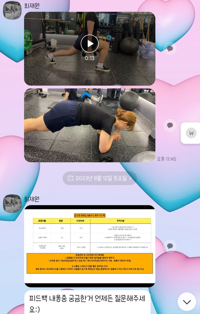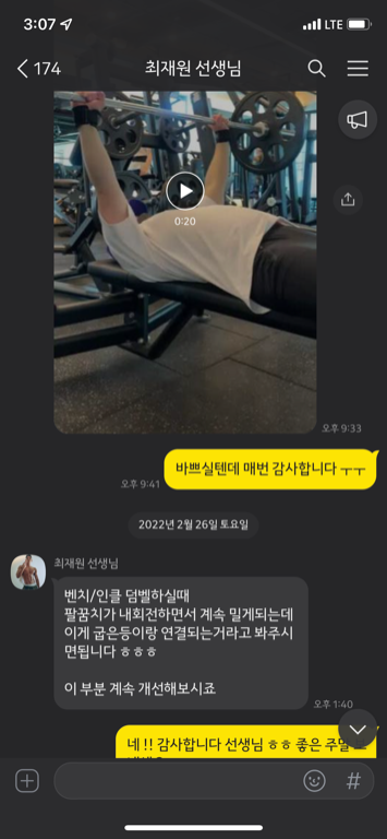 수업때마다 제가 운동하는 영상을 찍어주시고 수업이 끝나면 영상을 보내주시면서 항상 피드백 해주시는게 너무 좋았고,