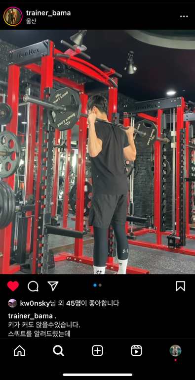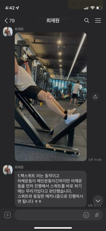 이번에 하체 운동 스쿼트를 배웠는데 지금까지 제가 한 스쿼트는 항상 할때마다 이물감이 느껴졌는데 재원쌤이 하라는 스트레칭을 하고 지금껏 운동 잘못하고 있었다는걸 깨달았습니다 가르쳐 주신대로 스쿼트를 하니까 정말 이물감 없이 스쿼트를 하게 되었고 너무 신기했습니다