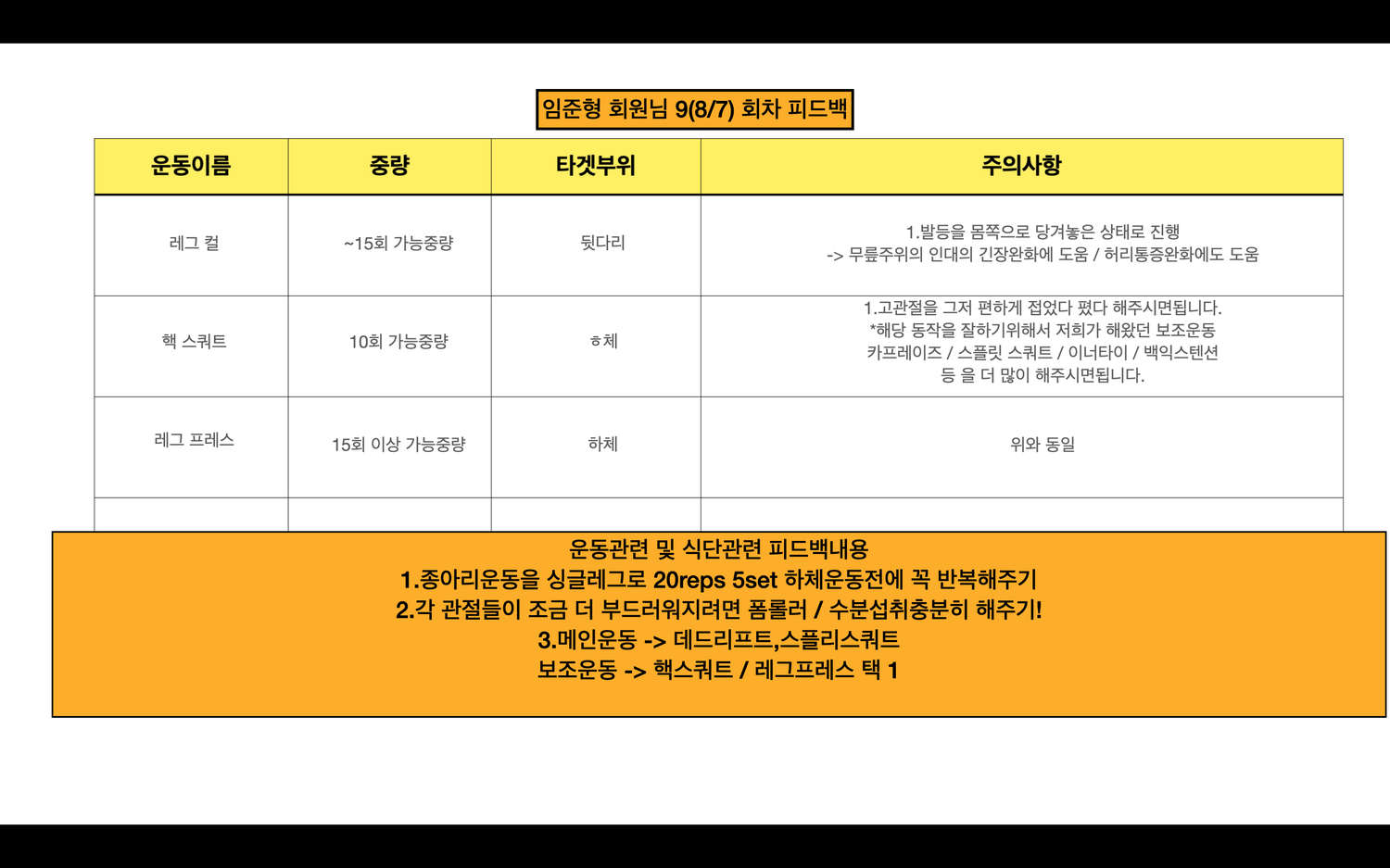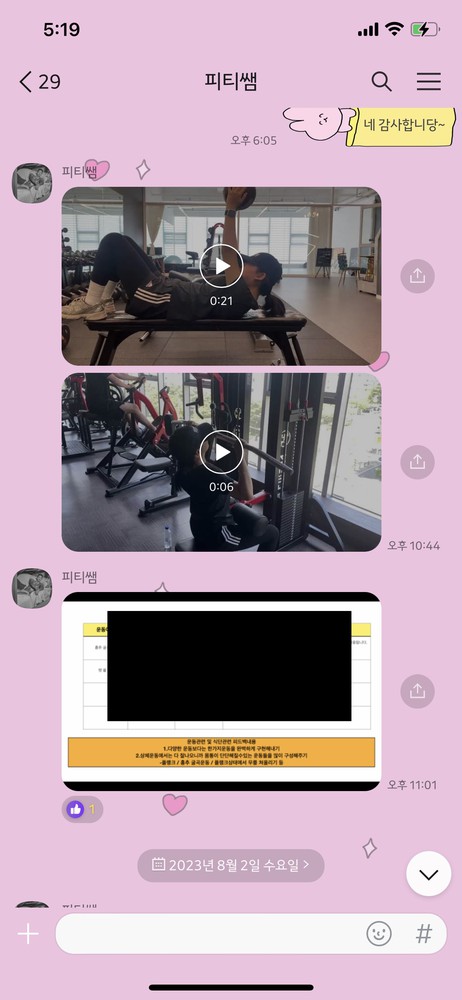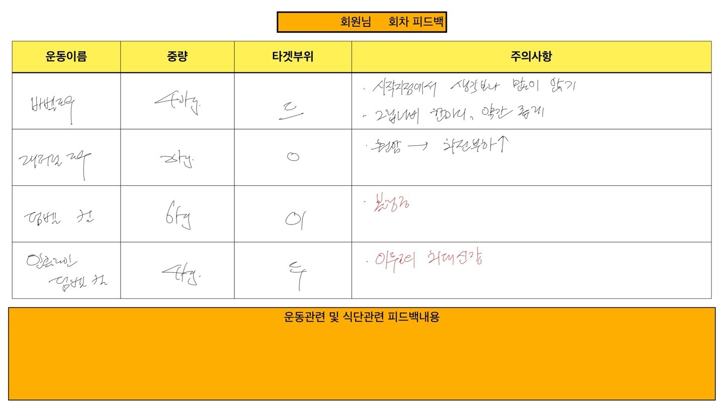또한 피티 후 매번 운동 자세 동영상, 운동 일지를 작성해 주셔서 혼자 복습할 때도 어려움 없이 할 수 있었습니다 ㅎㅎ 다시 처음으로 돌아간데도 바마 선생님한테 갈 거 같아요 감사합니다 ☺