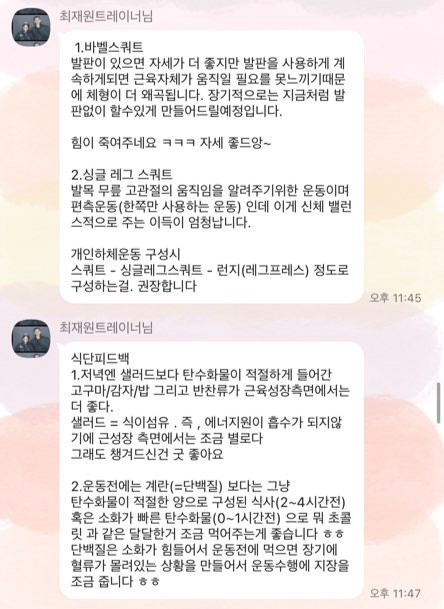 기능성 평발, 거북목, 말린 어깨 등 제 체형의 장단점과 그에 맞는 운동법을 알려주셨고 끊임없이 소통하며 질문에 자세하게 답변 잘 해주시고 운동 후 영상을 통해 피드백을 해주셔서 개인 운동하면서도 보며 건강하게 운동하고 있습니다.