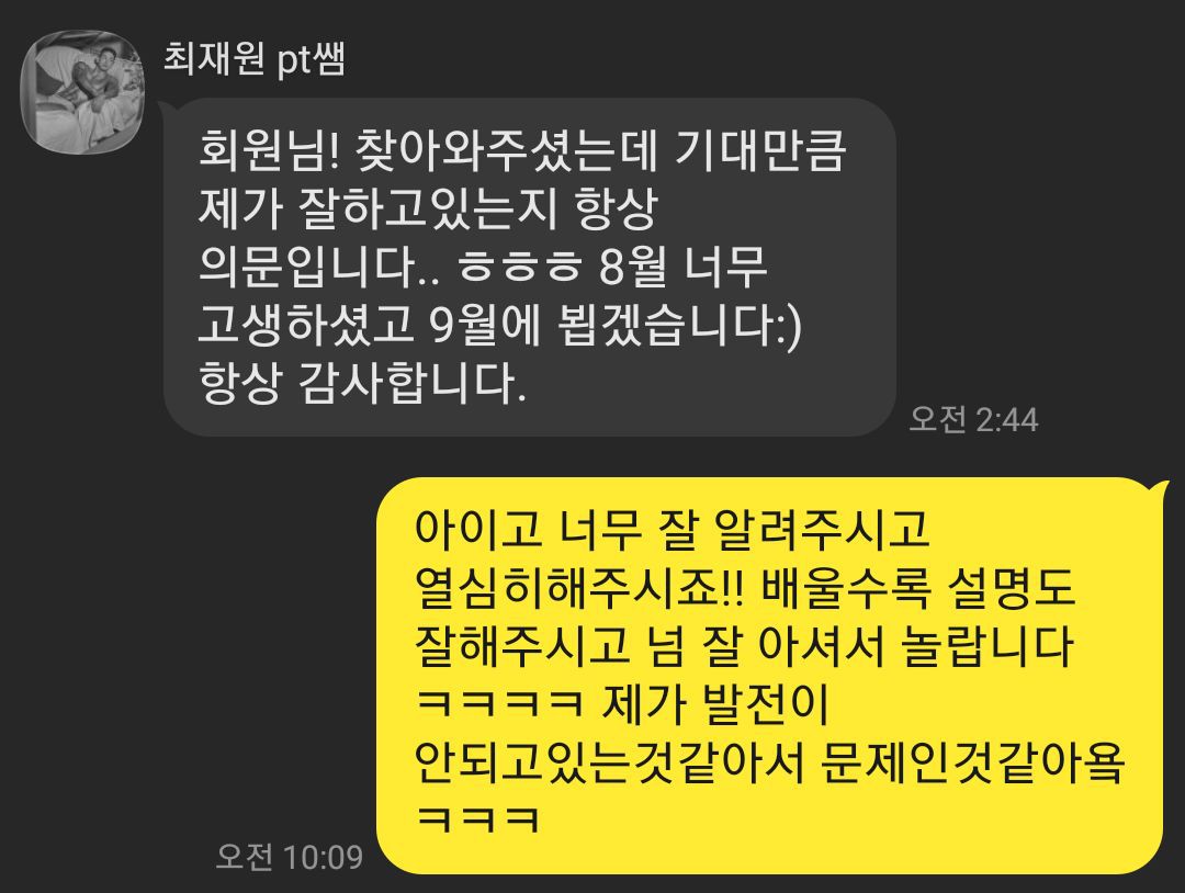 수업이 끝나자마자 바로 운동 피드백 보내주시고 피티가 끝난 뒤에도 모르는것이 있으면 친절하게 잘 알려주십니다 그리고 제가 만난 분중에 이렇게 운동에 진심인분 처음 봤습니다ㅎㅎ
