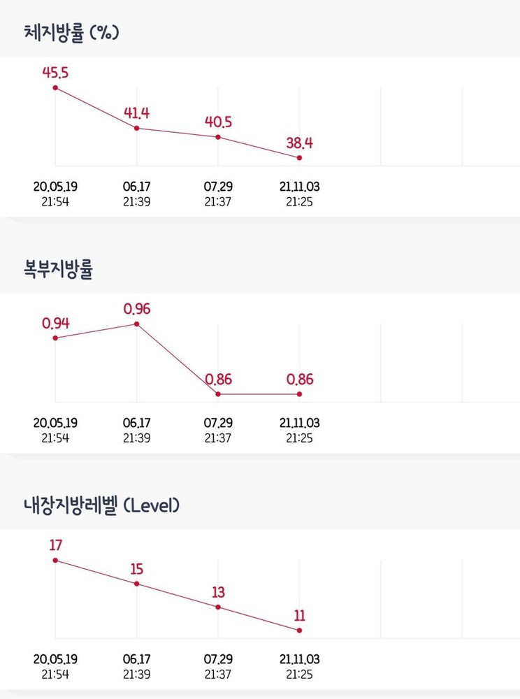 운동을 하다 지쳤을때 항상 아낌없이 칭찬해주시는 한터선생님 도움으로 얼마되진 않았지만 체지방과 골근력이 아주 많이 좋아졌습니다! 앞으로도 많이 도와주세요~! 그리고 감사합니다!