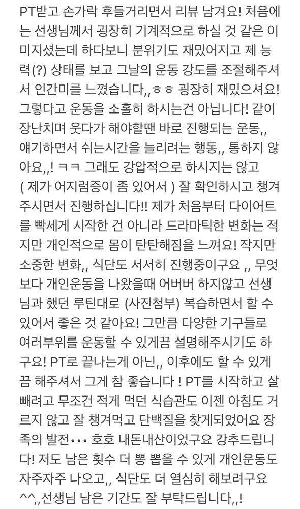 왜 PT를 이제서야 받기 시작했는지 후회 될 정도에요 앞으로 꾸준히 열심히 해야겠습니다
