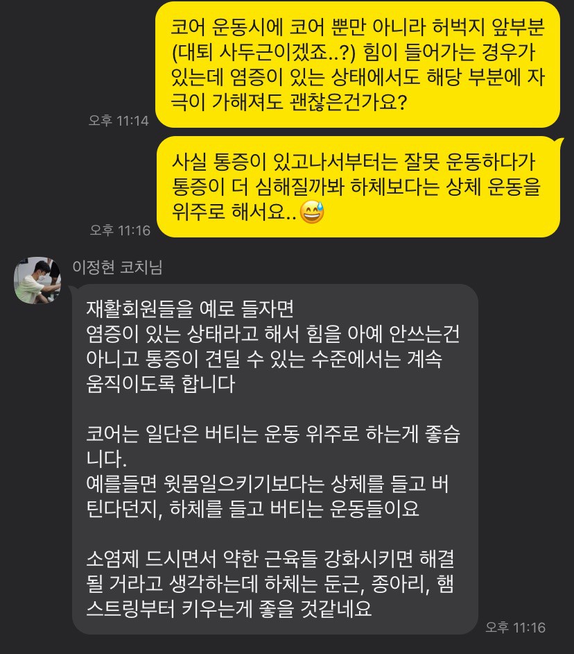 지금 코치님께처음 1회 상담 받았음에도 불구하고 매우 친절하게 제 몸을 하나하나 점검 해주셨고, 어느정도 제 문제를 파악해주셨습니다.