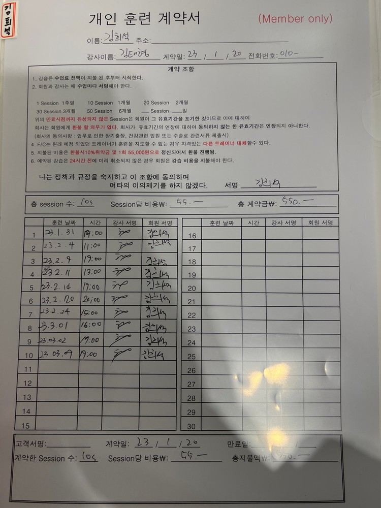 10회가 짧았다면 짧았지만 트레이너님이 너무 친절하시게 자세 하나하나 잡아주시고 운동이 끝나면 늘 정리해서 보내주시는게 개인운동 할때 너무 도움도 되서 좋았습니다 !