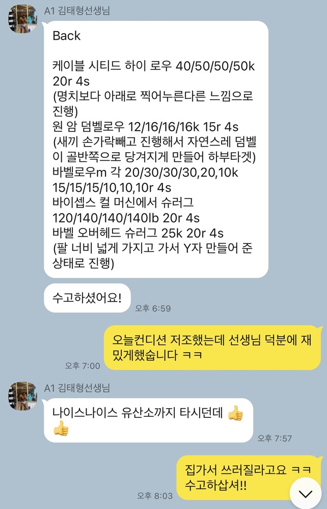 1. 매 수업마다 운동을 한 내역과 운동 피드백을 카톡으로 보내주어 혼자 운동할때 도움됨