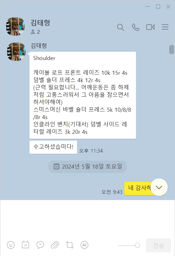 한 해 한해 지나면서 체력이 떨어지는게 느껴지고 어깨 통증이 생기면서 운동을 해야겠다고 마음을 먹고 pt를 알아보던 중 태형샘을 만나게 되었습니다. 어깨 통증의 원인과 해결 할 수 있는 운동법들에 대해 알려주셔서 어깨 통증은 금방 해결할 수 있었습니다 운동 자세 하나하나 세세히 봐주시고 그날그날 수업했던 운동에 대해서 톡으로 보내주시고 운동하면서 잘 못했던 부분이나 중요한 부분들에 대해서 코멘트도 같이 보내주셔서 나중에 혼자서 개인 운동할 때 많은 도움이 되었습니다 앞으로 pt 받으실 분들 멋지고 잘생기고 수업도 잘해주시는 태형샘께 받으세욥 ㅎㅎㅎ