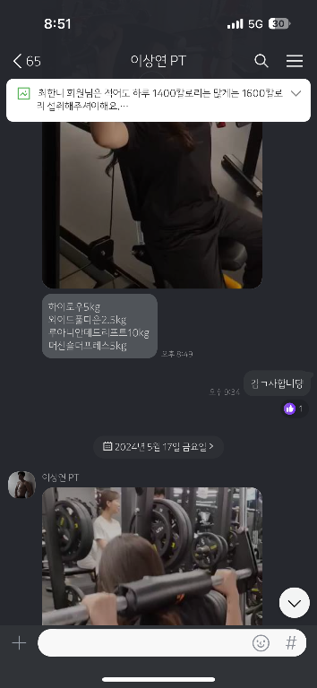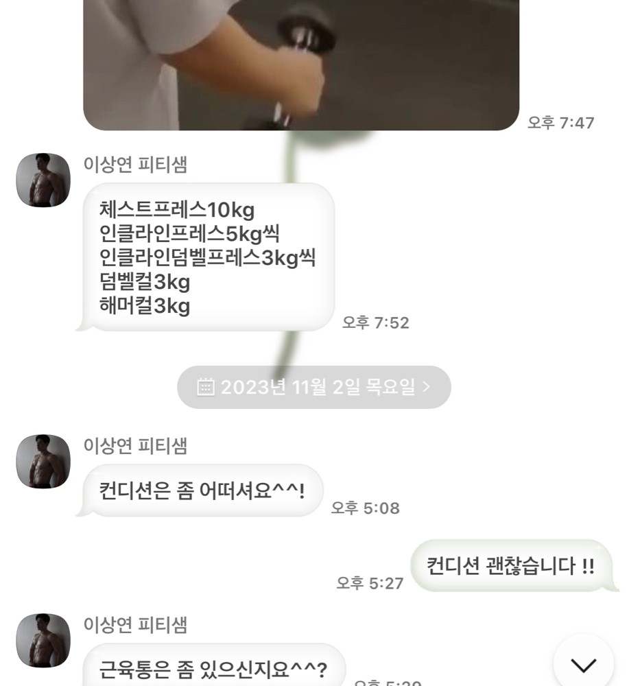 2) 그날 어떤 운동을 했는지 운동 목록&무게를 카톡과 동영상으로 매번 기록해 주셔서 혼자 운동할때마다 큰 도움이 되었습니다.