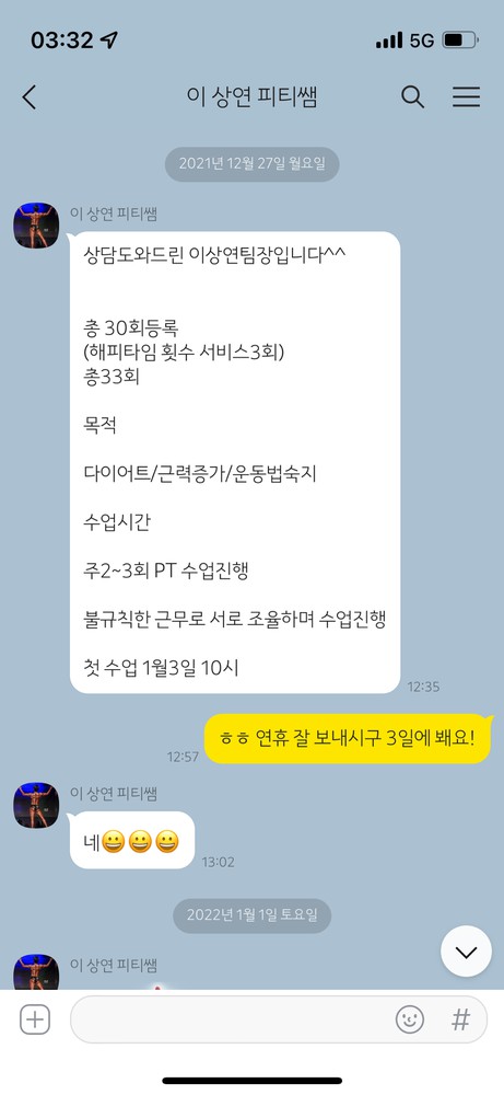 처음에는 금액도 부담이고 내가 운동을 꾸준히 할 수 있을까~~ 하는 걱정이 앞섰는데 상담도 너무 잘해주시고 저의 몸상태를 꼼꼼하게 체크해주고 피드백해주니 이상연트레이너쌤을 믿고 운동해도 되겠다는 생각이 들어 시작하게되었습니다.