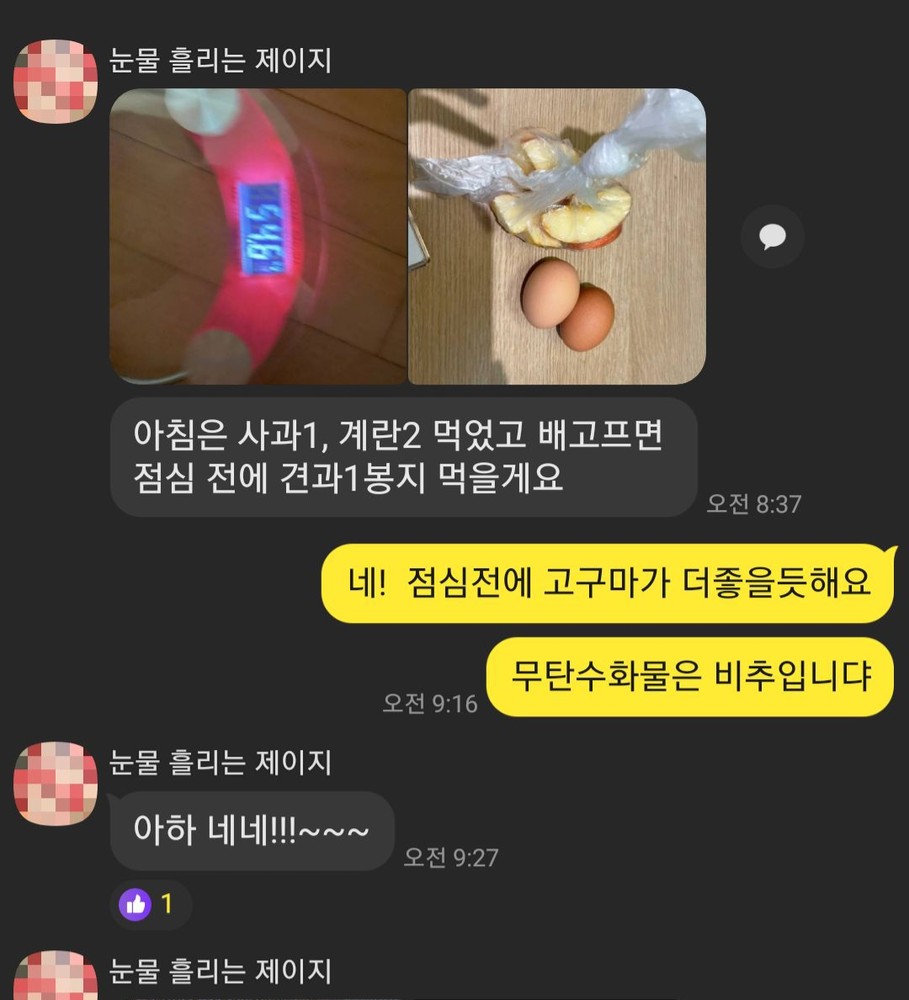 체중 체크 및 식단관리도 잘 해주십니다!(의지만 있다면 1000% 목표달성하실 수 있어용~아자아자!) 원래 혼자 식단 관리했으면 양심의 가책을 느끼고 그냥 먹고싶은거 먹었을텐데, 계속 물어봐주시니까 저스스로 관리를 하게 되는 느낌이더라구요~ 감사해영🙇♀️