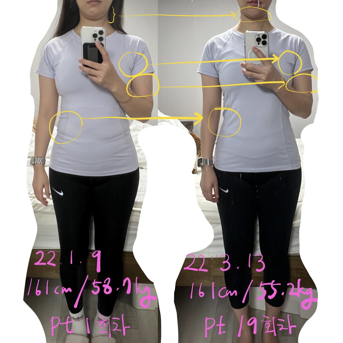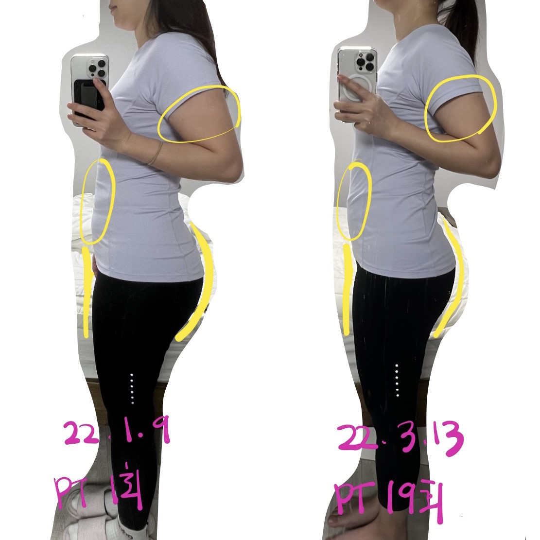 특히 선생님과 하체 운동을 많이 해왔고 요즘은 워밍업으로 스쿼트를 기본적으로 하는중인데 피티 첫날과 현재를 비교해보니 허벅지 살이 정말 많이 빠졌더라구요👍동시에 체력이 많이 좋아졌어요 버피테스트를 저어어어엉말 힘겹게 했고 플랭크도 1분까지 겨우했었는데 지금은 전보다 더 잘하구 플랭크 2분까지 찍어봤습니당:)