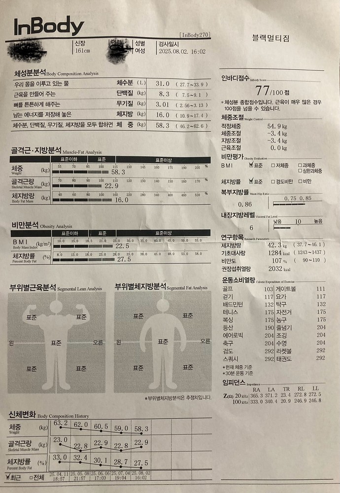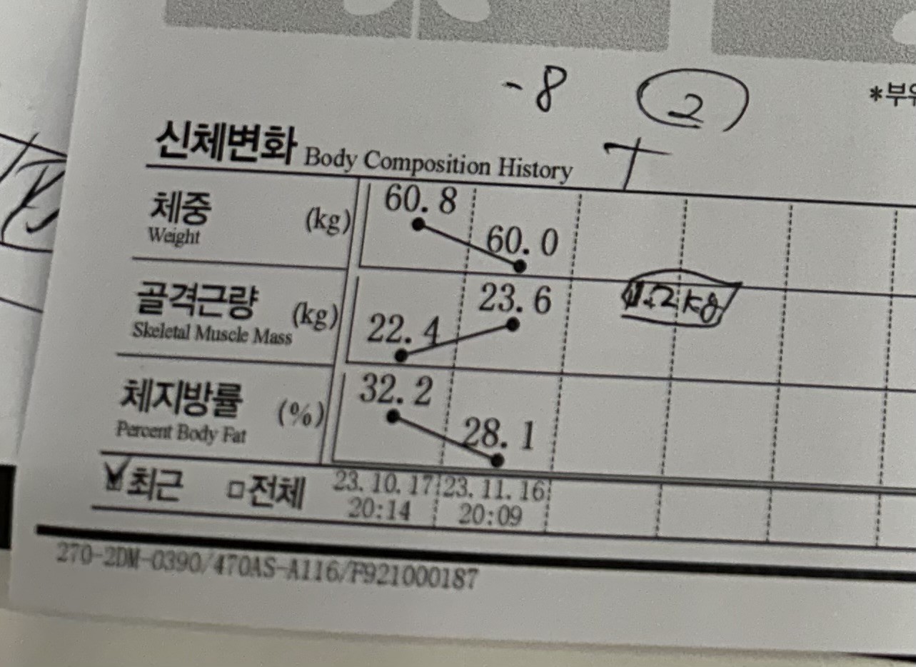 체중 감량도 단순히 살만 빠진 게 아니라, 근육량 손실은 거의 없이 체지방 위주로 잘 감량돼서 눈바디 변화가 확실했습니다. 무엇보다 운동할 때 자세를 정말 꼼꼼하게 봐주셔서 잘못된 습관도 많이 교정됐어요.