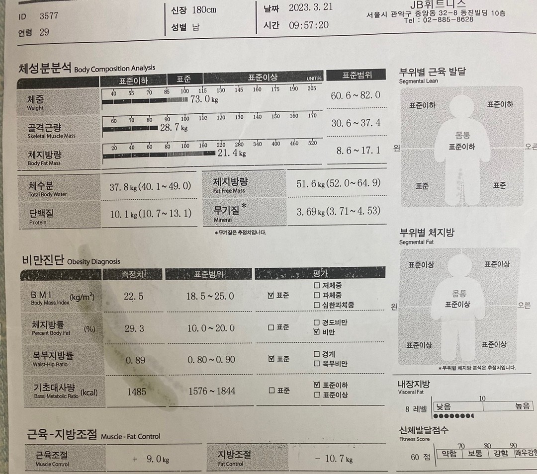 체지방률 비만에 BMI 과체중 상태에서 PT 30회만에 정상범위에 들어왔어요! 식단은 자신없어서 하나도 안하고 운동도 딱 PT 때만 가서 해서 솔직히 체중이 줄거라는 기대를 크게 안하고 운동법만 배워도 좋겠다는 생각으로 시작했는데도 주변에서 살이 많이 빠졌다, 보기 좋다는 얘기 정말 많이 듣고 있어서 현진쌤이랑 PT 안했으면 어땠을까 싶습니다 ㅎㅎ 운동을 원리부터 차근차근 알려주시고 자신감 뿜뿜할 수 있게 북돋워주시는 선생님 덕분에 근력운동 완전 초보인 상태에서 이제 헬스장 가는게 즐거울 정도로 운동이 재밌어졌어요 감사합니다!!