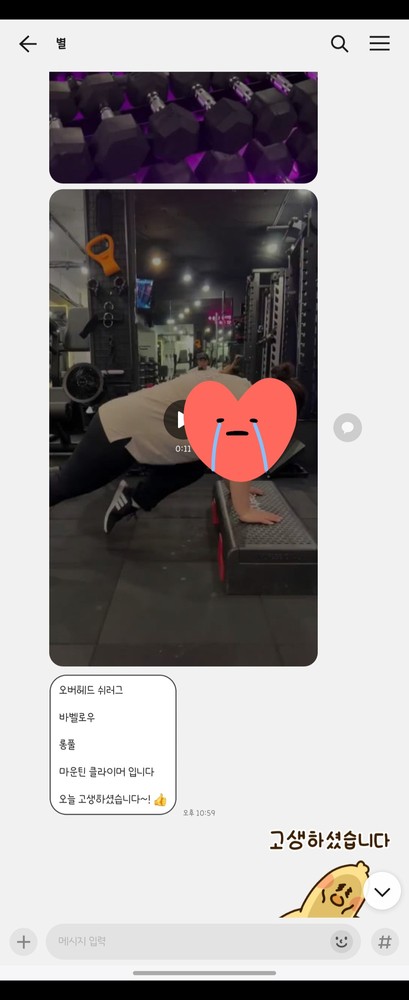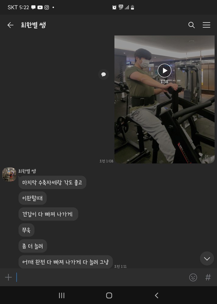 수업이 아니더라도 이렇게 개인적으로 물어봐도 운동에 대해서 만큼은 설명도 자세하게 알려주시는 선생님인것 같습니다 최고입니다! 2023년 새해 시작하면 다시 한별쌤한테 피티재등록하러가겠습니다!!