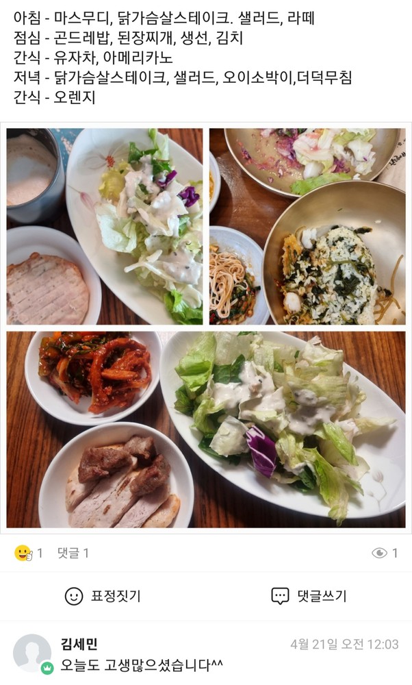 한달이 지나고보니 김세민강사님을 만난게 행운이었어요. 사실 두번째부터 정말 성의있다는 느낌을 받았어요. 식단 올리면 꼼꼼히 다 봐주시고 영상도 올려주시고 매번운동하는것도 꼼꼼히 기록하시더라고요.