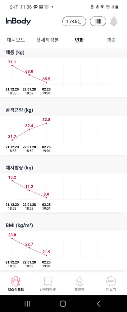 성심성의껏 세세하게 알려주신 덕분에 정확한 자세와 무리하지 않은 컨디션으로 부상한번없이 꾸준히 운동을 할 수 있었고 2달만에 체중은 -6KG, 골격근량은 +1.1KG 늘었습니다.
