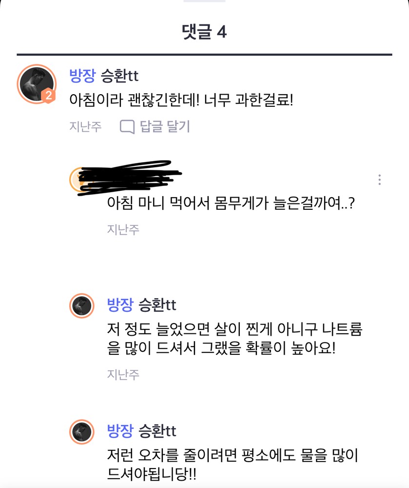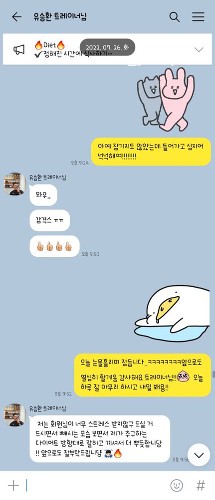 다이어트 목적도 있어서 체중이 몇백그램 왔다 갔다 하는거에 스트레스 받았는데 그런 멘탈적인 부분도 잘 이끌어 주세요! 식단 잘 지키면서 꾸준히 하는게 중요하고, 하루하루 체중에 신경쓰지 않아도 된다고 멘탈케어 해주셔서 스트레스 받지 않고 다이어트 할 수 있었습니다!👍