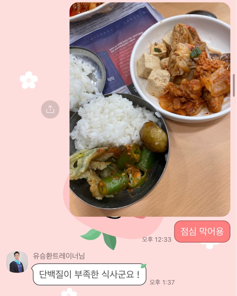 제가 운동이 처음이라 잘 못하고 몸에 안좋은 곳도 많은데 세심하고 꼼꼼하게 봐주십니당. 식단도 항상 잘 봐주시고 친절하셔서 넘 좋아욧!
