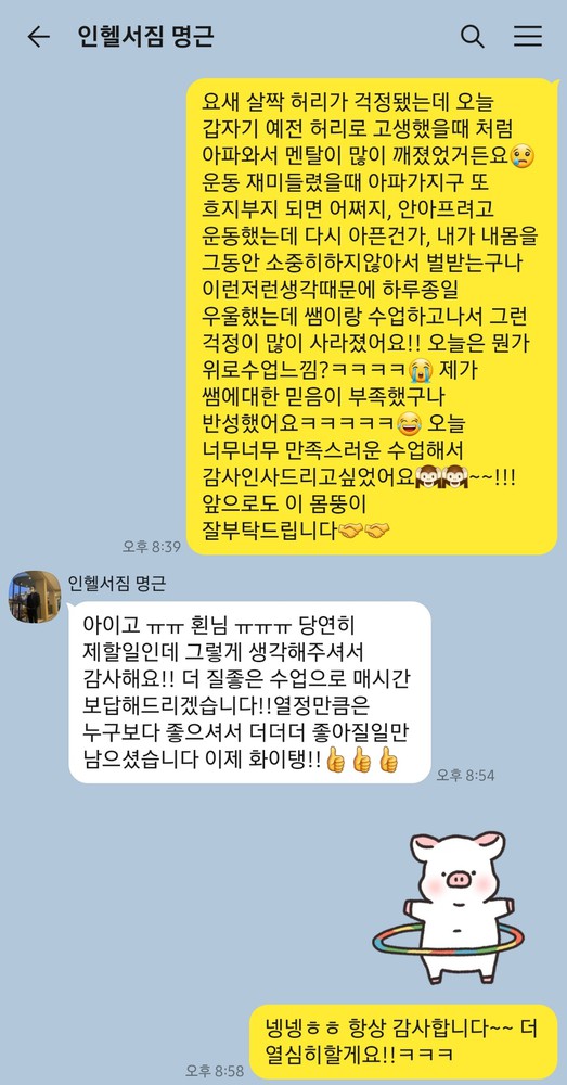 안녕하세요!! 박명근 트레이너 입니다.💪🏻 회원님의 소중한 리뷰 진심으로 감사 드립니다🙏🏻🙏🏻 늘 유쾌한 웃음으로 제 수업에 즐겁게 임해 주셔서 진심으로 감사드려요! 저도 덕분에 매일 첫타임 부터 좋은 기운을 얻으며 시작해서 회원님이 제마지막 타임 회원님까지 늘 좋은 영향을 주고 계셔요 ㅎㅎㅎ 하는 만큼 쑥쑥 개인운동도 철저히 너무 잘해주셔서 저또한 늘 즐거운 마음으로 수업에 임하고 있어요!! 앞으로 남은 저희 운동도 더 즐겁고 보람찬 시간으로 가득 채워 드리겠습니다!! 같이의 가치 악🔥🔥🔥🔥🔥