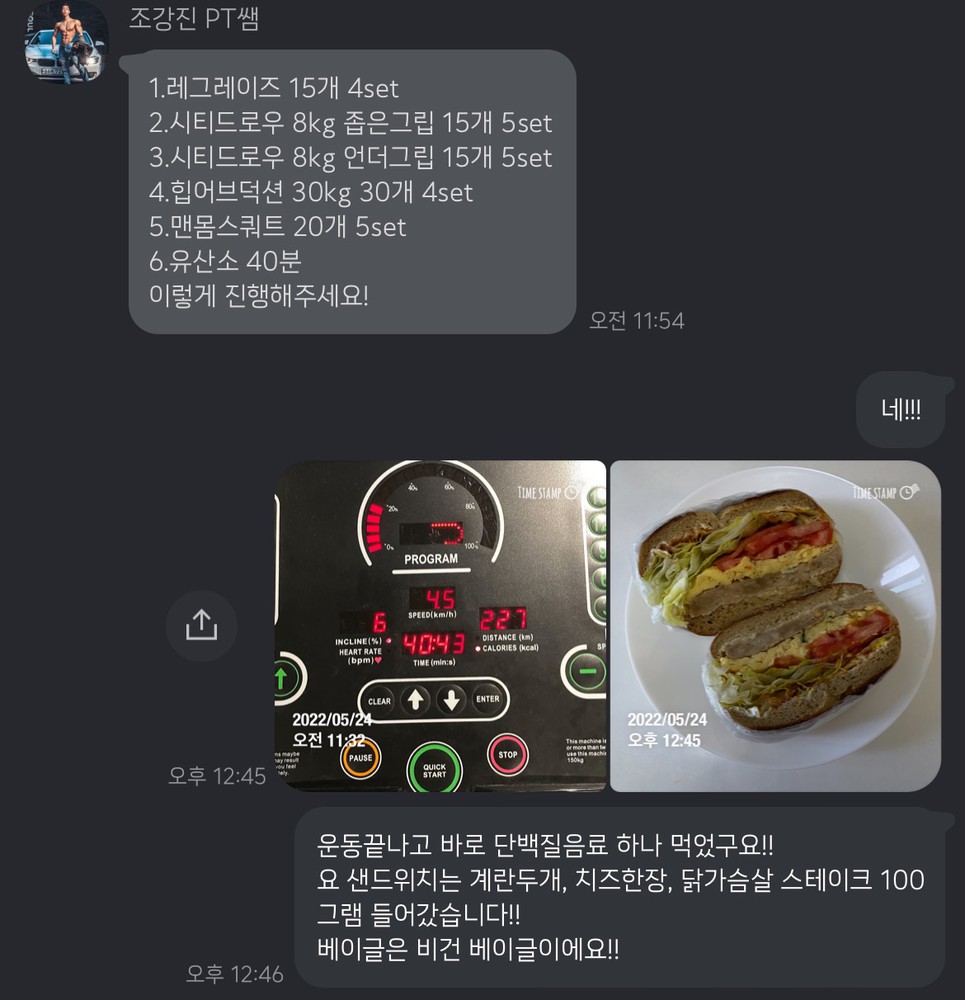 그리고 운동하기 전에는 닭가슴살만 먹어야 하나 넘 우울했는데 쌤은 무작정 식단을 강요하지 않고 꾸준함이 제일 중요하다며 지금 제가 먹고 있는 식단에서 부족한 영양소가 무엇인지, 식사 텀을 어떻게 조절하면 좋을지 자세히 조언해 주셔서 많은 도움이 되고 있습니다.