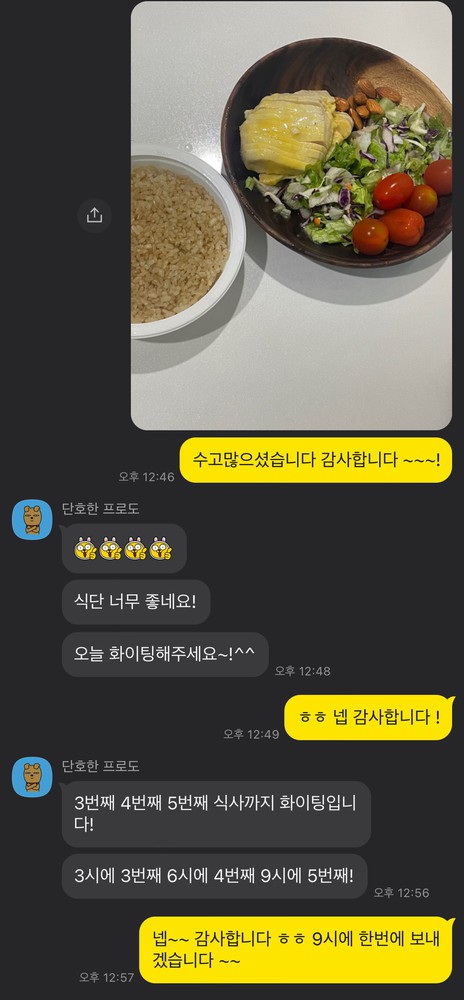 식단적인 부분에서도 가끔은 미흡할때도 있지만, 그럴때마다 격려해주시고 조언해주셔서 부담감 없이 식단을 지켜나가고 있습니다!