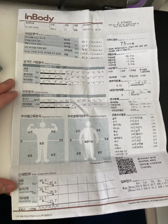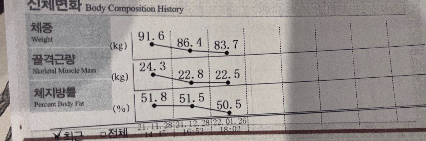 수업 받은지 한달만에 체중 -1kg에 근육량 +0.4kg 체지방률 -2%가 나와버렸습니다;;