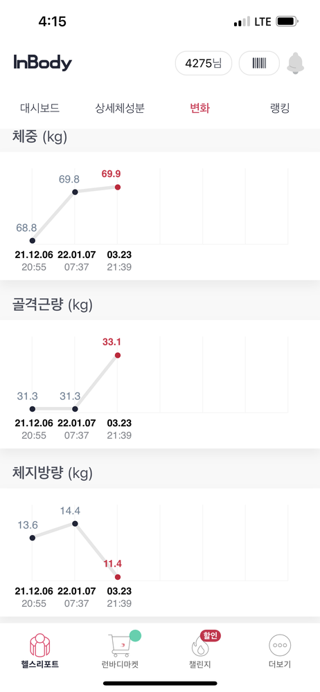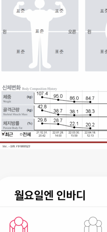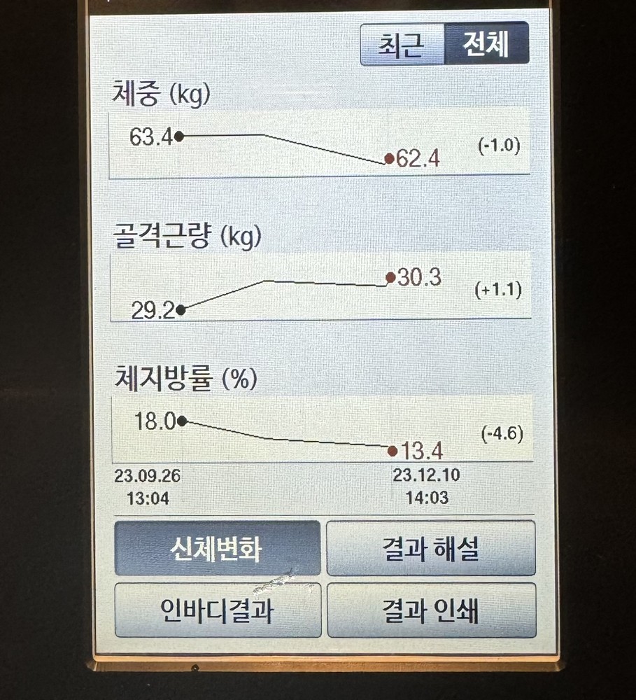 크으.. 수업 아홉번만에.. 딱 봐도 인바디 변화가 있을 거 같아서 뜬금포로 인바디 재봤는데 역시👍