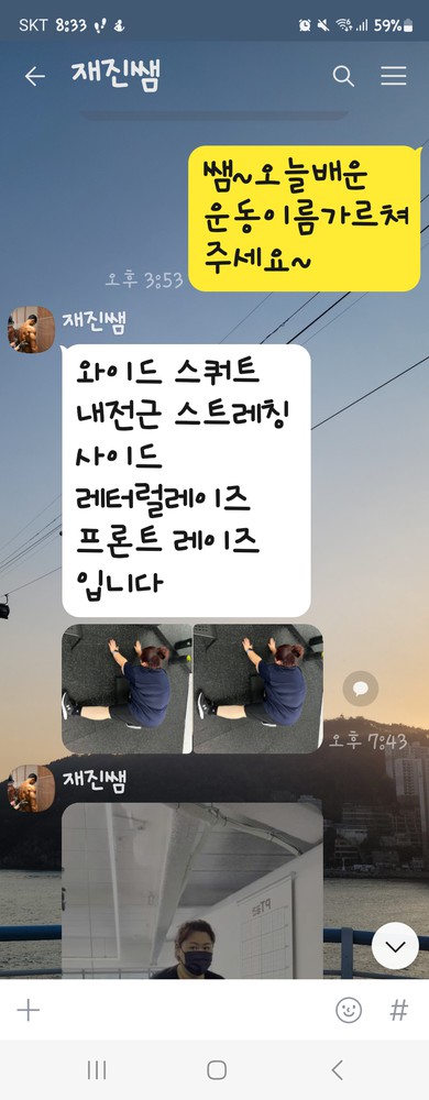 매일 아프던 허리와 여기저기 아프던 관절들이 쌤이랑 운동하면서 나아졌고 부실한 하체 덕분에 하체운동은 꿈도 못꿨었는데 이제 혼자서도 잘해욧! 항상 수업도 재밌게 해쥬셔용 쌤 최고!♡♡