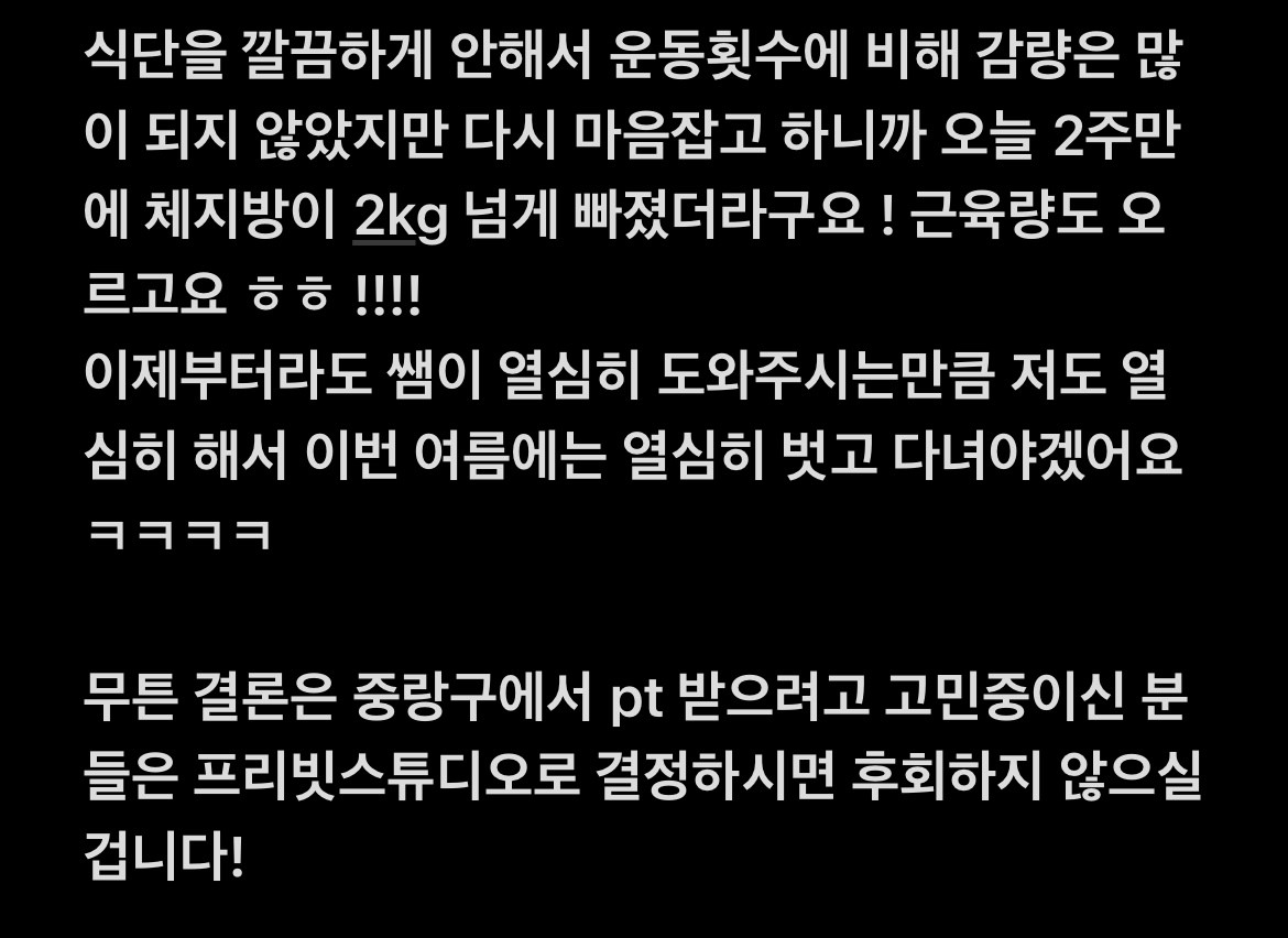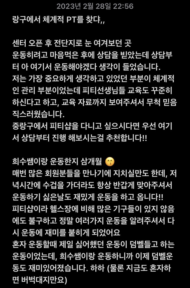 PT하려고 고민하시는 분들, 희수팀장님 정말 추천해요!! 고민은 시간만 늦출 뿐… 얼른 시작하세요! 더 이상 운동이 두렵지 않으실 거에요