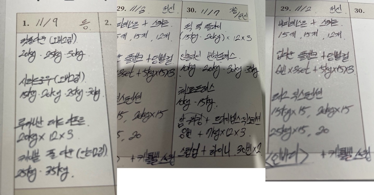 수업때마다 기구세팅법, 자세, 자극점 등을 엄청 꼼꼼하게 알려주셔서 개인 운동도 어렵지 않았고, 수업 끝나고 작성해주시는 트레이닝 일지도 운동 루틴 참고하기에 너무 좋았어요!