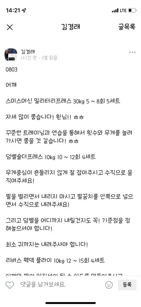 시간적으로 여유가 없어 두달밖에 못하고 개인운동을 하게되었는데 바프나 새로운 목표가 생기면 반드시 경래쌤과 다시 운동하고싶습니다.!
