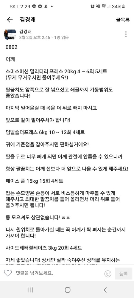 예전에 운동할때는 웨이트 운동을 할 줄 몰라서 헬스장에 가면 유산소 운동만 하고 오는 경우가 많았고 웨이트를 하더라도 자세가 틀려서 다른 부위가 아픈 곳이 있었어요 김경래쌤 만나면서 유산소 말고도 재밌게 웨이트도 하게 되었습니다. 또한 수업하면서 찍어주시는 동영상 보면서 틀린 부분도 잘 알려주시고 그날 그날 운동자세 피트백 보내주셔서 참고하면서 운동 할 수 있어서 좋았습니다.
