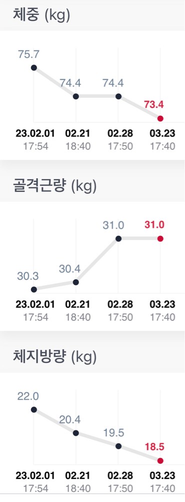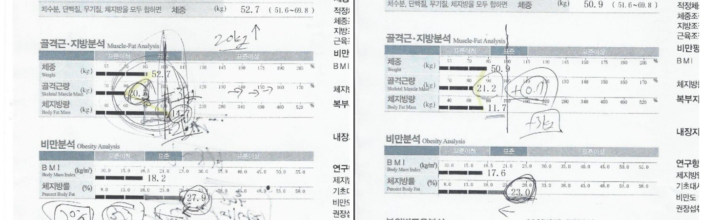 다짜고짜 바디프로필을 찍고싶다고 햇는데 한 2주정도만 식단이랑 운동강도?를 보자고 하셧고 바프는 조금 미루게되었습니다 ㅎㅎ지금까지 레슨을 받으며 체지방은 -3kg 근육량은 +2kg !!! 체중은 비슷하지만 몸매가 많이 바뀌어서 만족도가 높습니다 ㅎㅎ 바디프로필까지 달려가보려구요